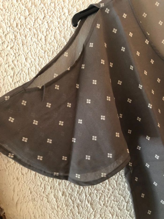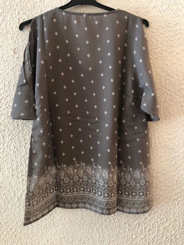 Blouse imprimée épaules dénudées. Col V. Manches volantées avec découpes aux épaules. Imprimé placé à la base droite. Longueur : 69 cm env. Composition : En crêpe 100% polyester. Taille : 38 Coloris : gris Prix : 14€ Réf : à.00 +1