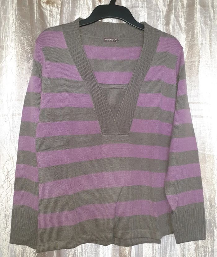Pull court rayé effet 2 en 1. Larges bord-côtes au col V dessus et au bas des manches longues. Base droite. Longueur 62 cm environ. Composition : Jersey 100% acrylique Coloris : violine/taupe Taille : 42/44 Prix : 16€ #sisterkayafemmet42 #sisterkayafemmet44