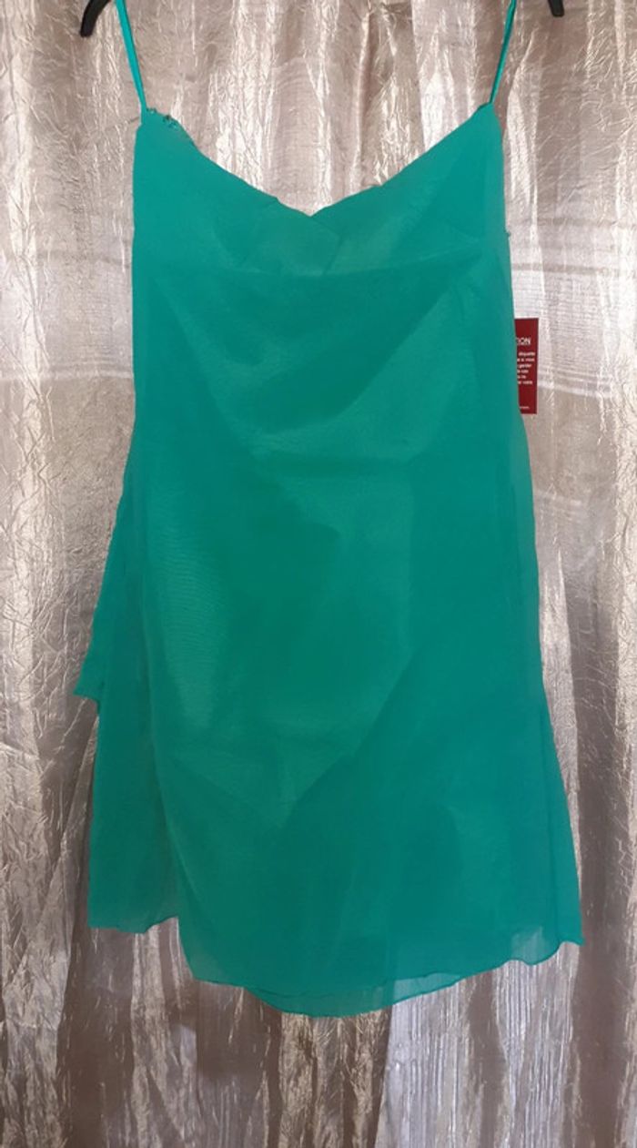 Robe à fines bretelles réglables. Fermé par zip côté Empiècement fantaisie au décolleté souligné d'un jeu de volant. Bretelles amovibles (maintien par bande silicone) Longueur milieu dos 78 cm environ. En 100% polyester, doublée 100% polyester Taille : 40 Coloris : aquarium Prix : 29€ #sisterkayafemmet40