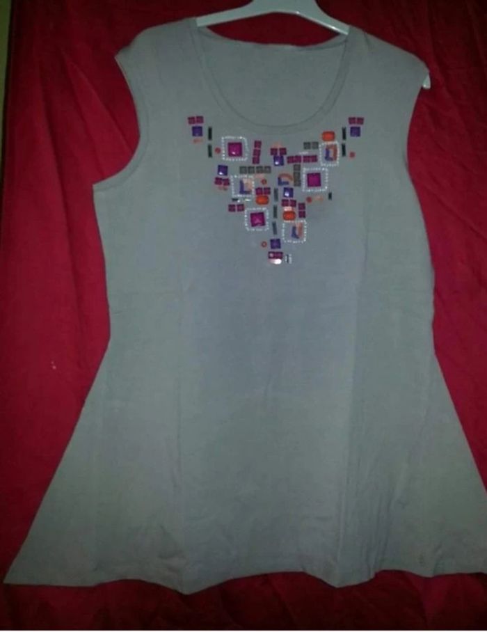 Débardeur long "bijou" Col en "U" souligné de perles et de sequins. Longueur 75 cm  Jersey 95% coton, 5% élasthanne Taille :  42/44 Prix : 12€ Coloris : taupe #sisterkayafemmet42