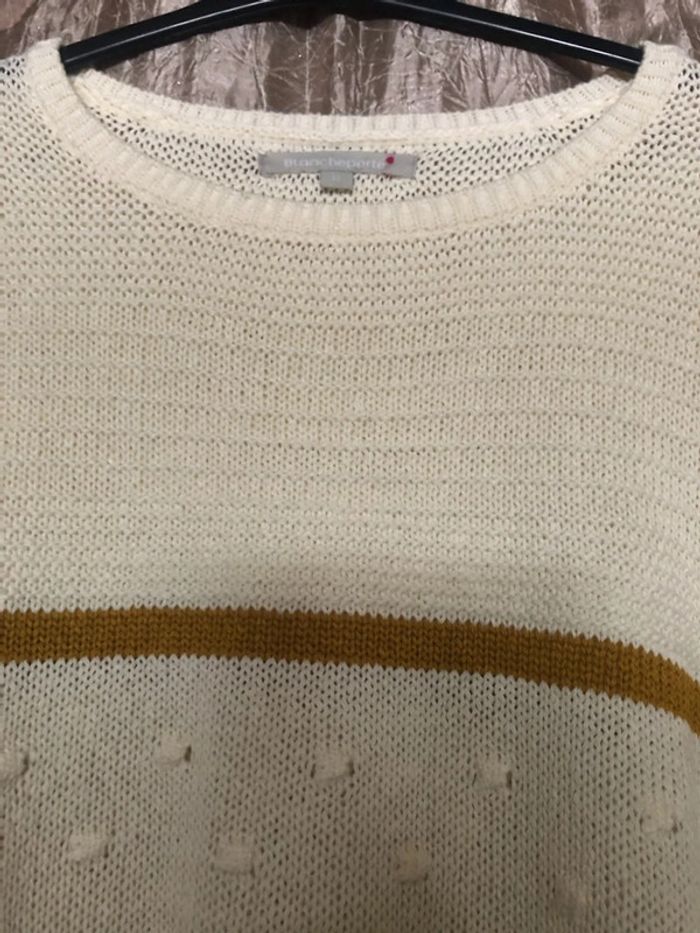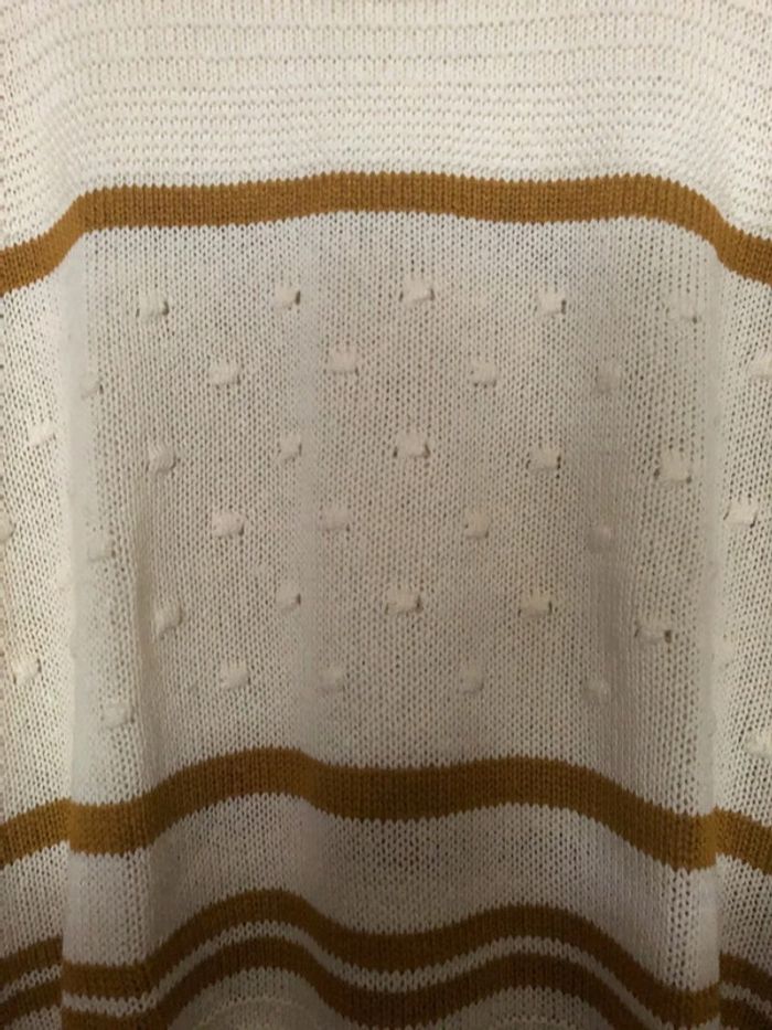 Col rond Coupe ultra confort aux épaules tombantes  Manches longues Jeux de points et de rayures contrastantes devant dos et manches Maille douceur Longueur : 62 cm env. Prix : 15€ #sisterkayafemmeT52 Ref : b.h +1