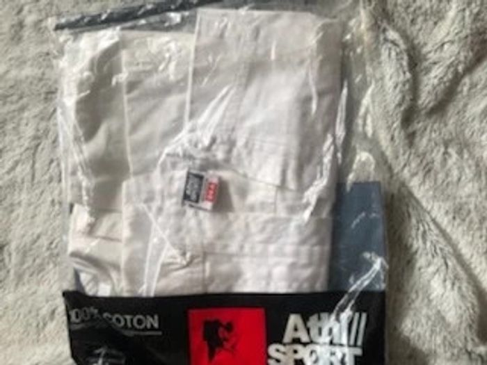 Tenue de judo neuve jamais portée Pantalon et veste. + ceinture blanche 100 % coton Taille : 6-7 ans Prix 14 € #sisterkayafille6ans #sisterkayafille7ans #sisterkayagarçon6ans #sisterkayagarçon7ans Réf : e. 00