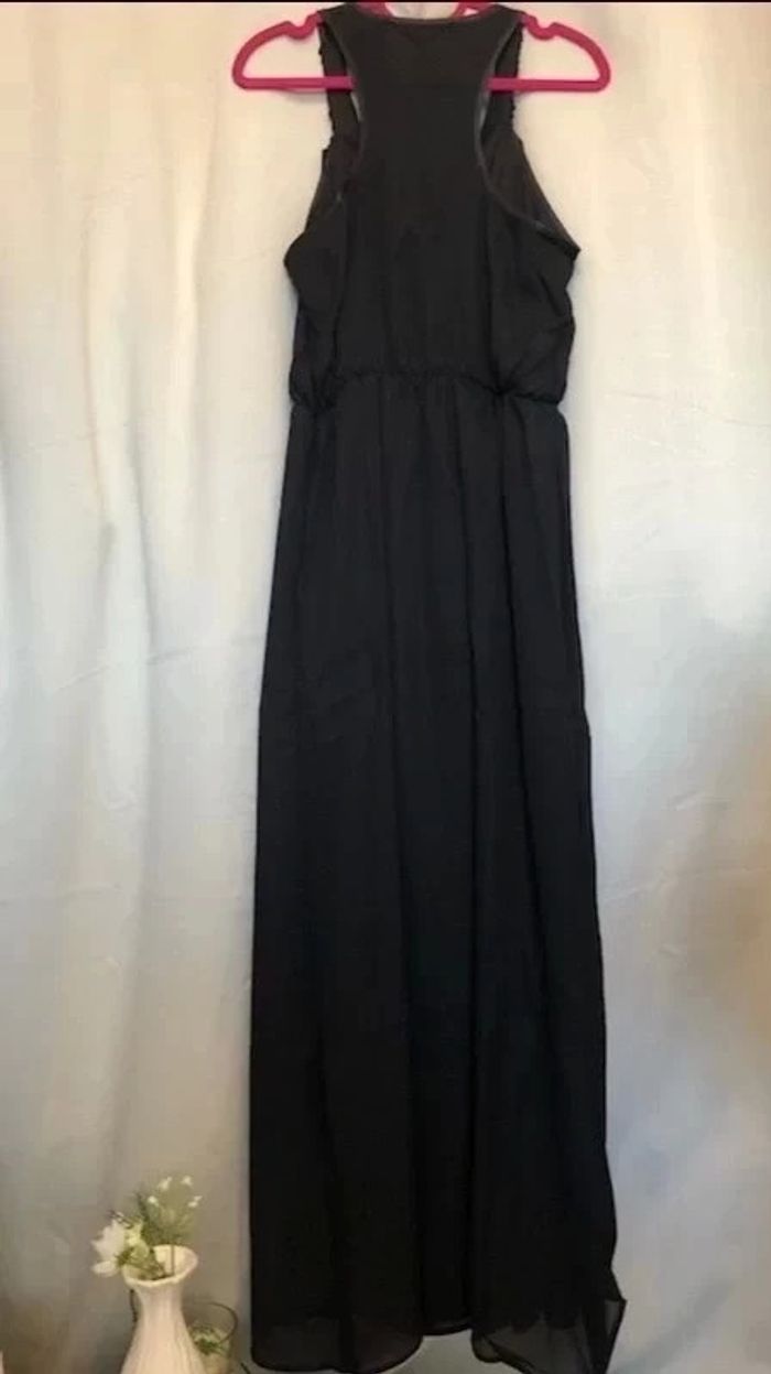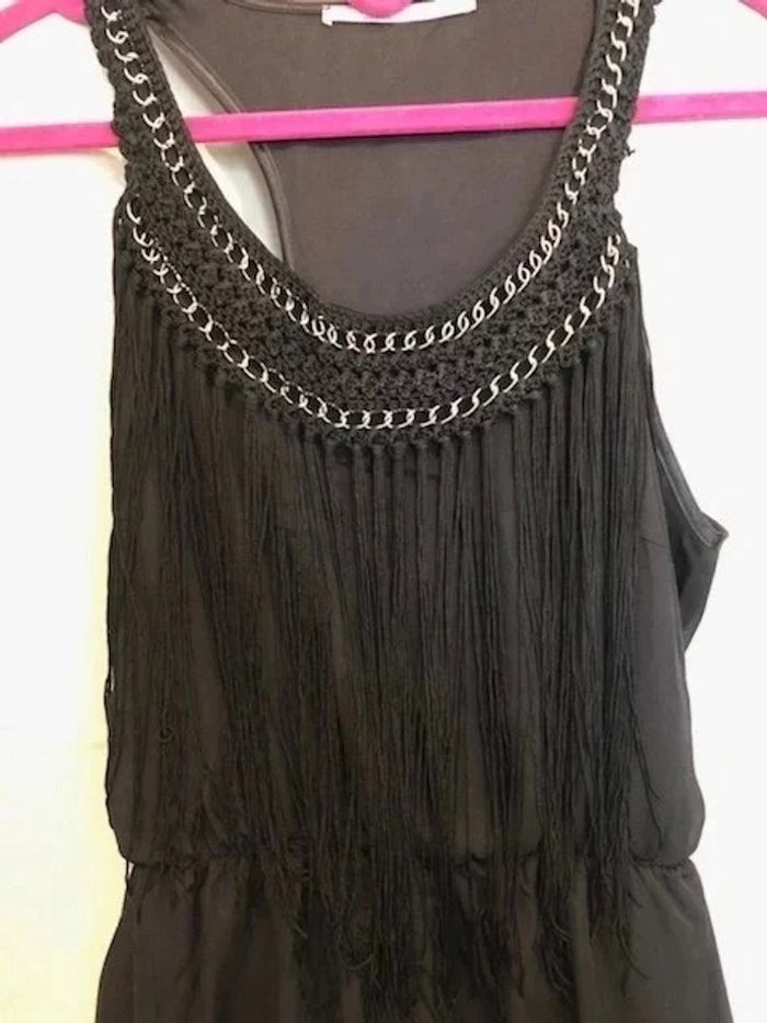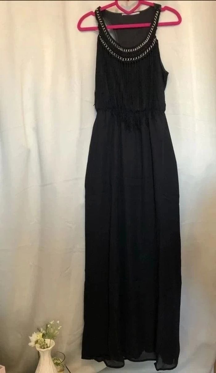 Robe longue fluide sans manches collection Premium - Encolure arrondie soulignée d'un empiècement crocheté animé de 2 chaines dorées et de franges - Taille élastiquée - Dos nageur brodé d'un biais en satin - Longueur 140 cm environ COMPOSITION - Robe longue en maille 100% polyester - Doublée 100% polyester Coloris : noir Taille : 38 Prix : 16 € #sisterkayafemmeT38 Neuve jamais portée Réf : À.00- 3S
