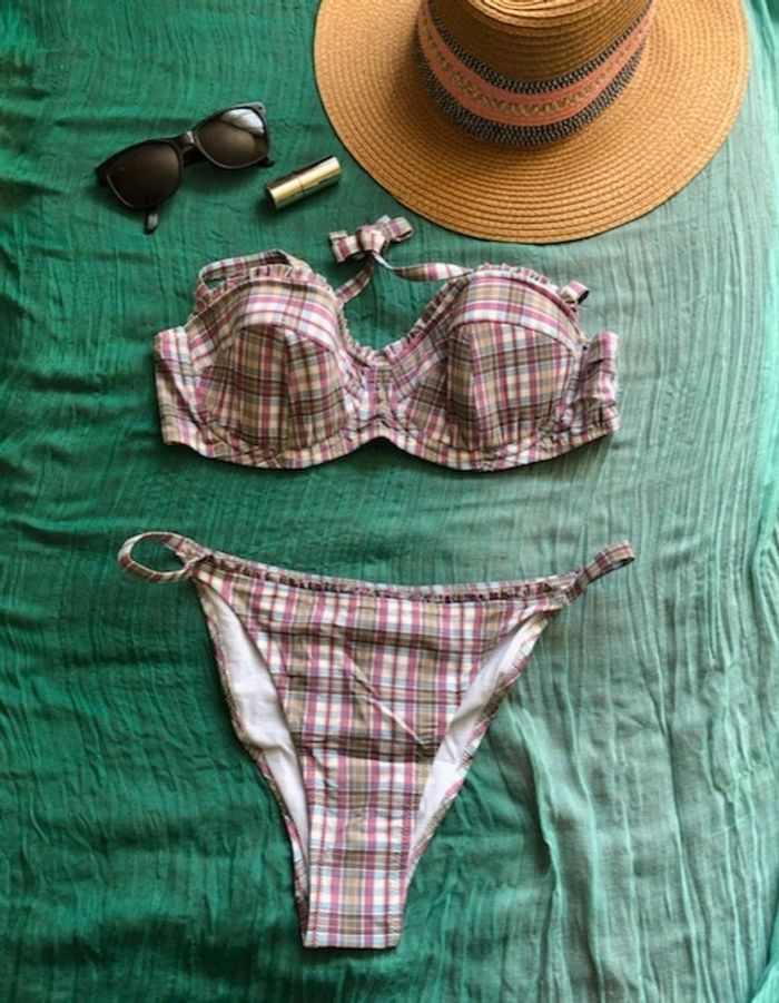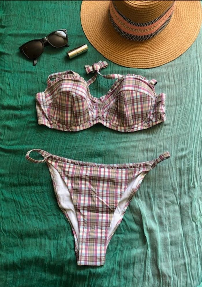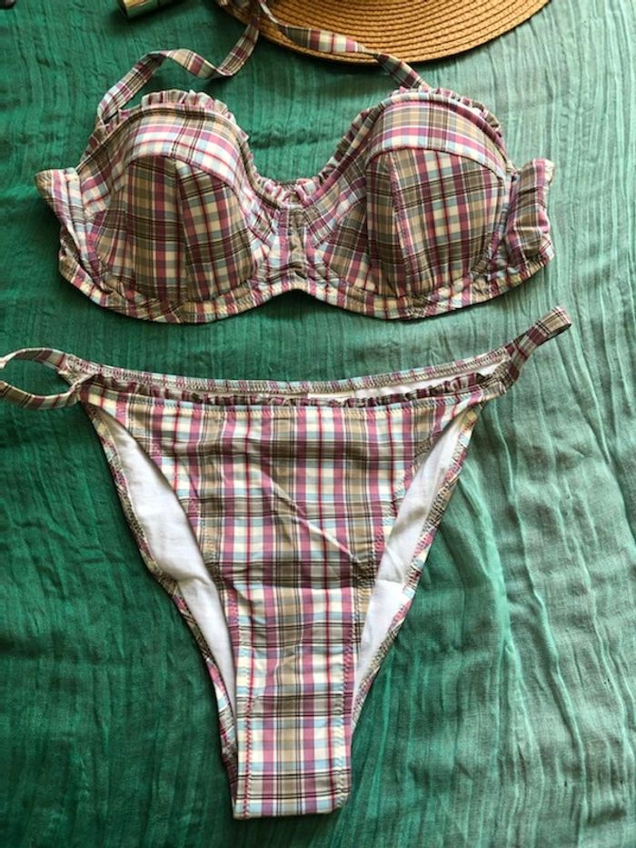 Maillot de bain 2 pièces Haut : - Armatures et rembourrage en mousse - Bonnets en 3 parties doublés de mousse - Bretelles tour de cou à nouer - Clip dos Slip : - bien échancré avec barrettes côtés, entièrement doublé - Froufrou sur le haut des bonnets et à la taille du slip devant En 86% polyamide, 14% élasthanne. Taille : 42 Prix : 12€ #sisterkayafemmeT42 #sisterkayamaillotdebain Réf : B.oo - 3S