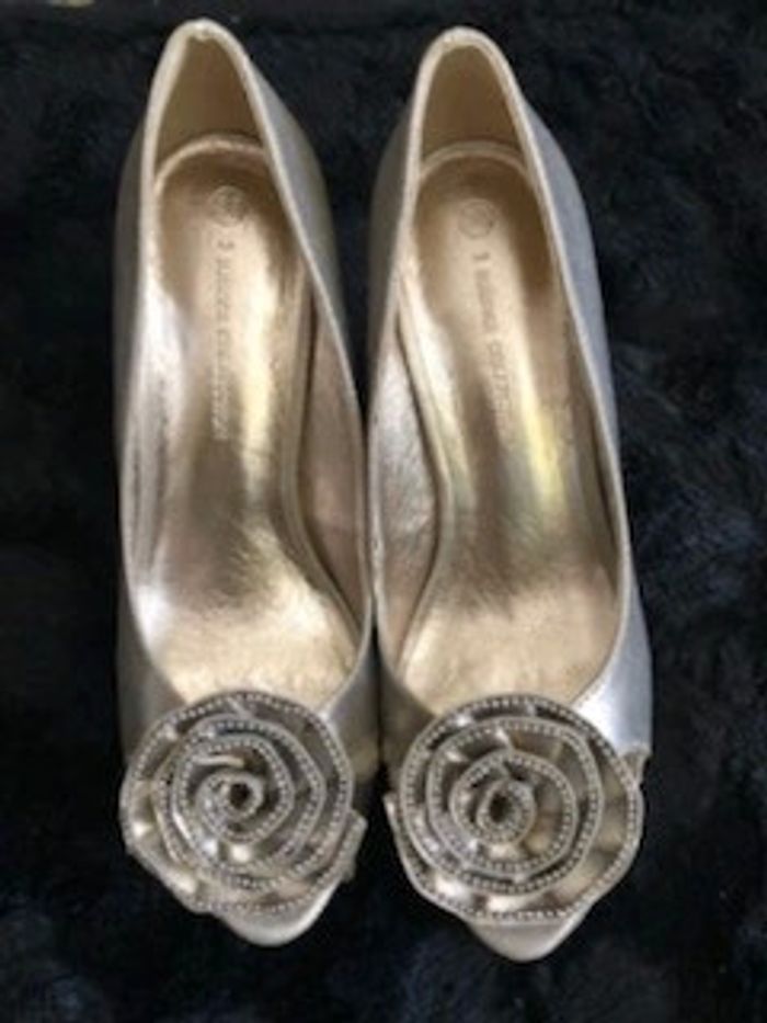 Escarpins pailletés Fleur perlée fantaisie appliquée. Côtés ajourés. Talon 10 cm + plateforme 1 cm env. recouverts. Dessus, doublure et sem. int. synthétique. Sem. ext. élastomère. Coloris : doré Pointure : 38 Prix : 15 € #sisterkayachaussurefemme38 Neufs jamais portés Remise en main propre possible sur Oyonnax Réf : b.e0
