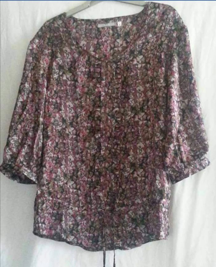 Blouse imprimée en voile Cordon à nouer et effet de fronces au décolleté carré, jeu de plis à la base. Manches longues raglantes finition froncée. Voile 100% polyester, doublé maille 100% polyamide. Taille : 36  Prix : 9€ #sisterkayafemmeT36 Réf : 6260221 - b.aa