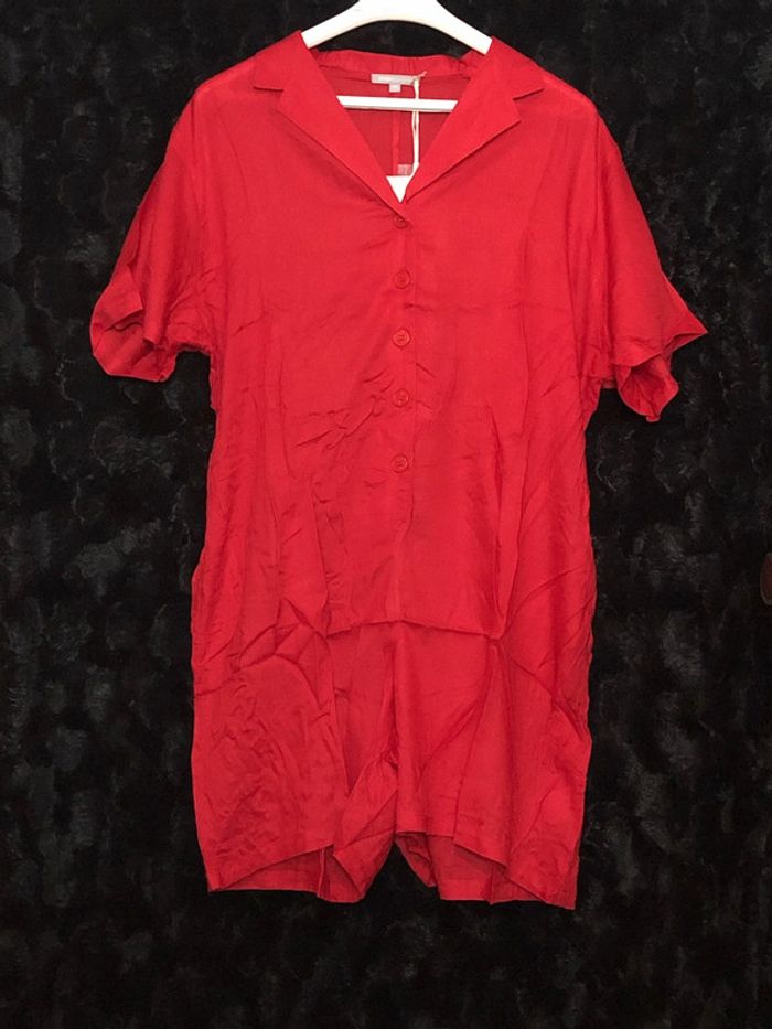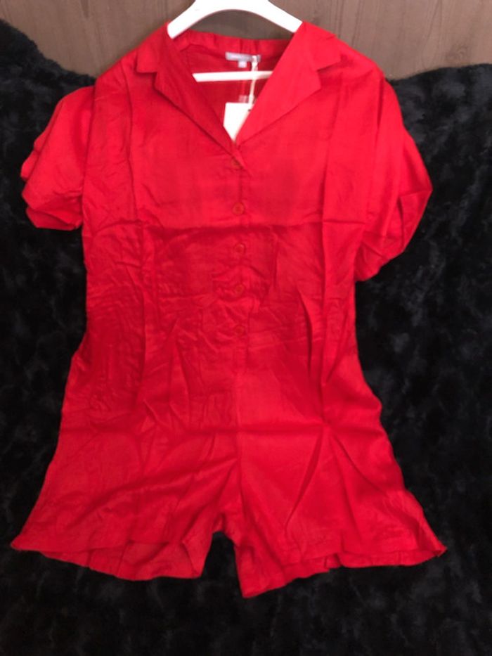 Combishort - Col chemise - Manches courtes - 2 poches - Fermeture par boutons - Ceinture sous passants à nouer à la taille - Matière fluide - Longueur 90 cm environ COMPOSITION 100% viscose Taille : 42 Prix : 13.5€ #sisterkayafemmeT42 Remise en main propre possible sur Oyonnax Neuf jamais porté Réf : 578234103038 - a.ii