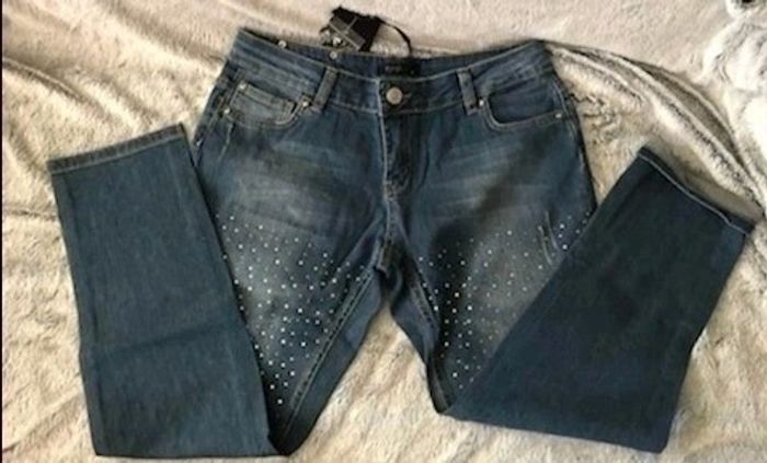 Slim neuf strassé Entièrement strassé. Fermé par bouton + zip. Coupe 5 poches. Longueur 7/8ème à porter roulotté à la base. Entrejambe 69 cm environ. Largeur bas 15 cm environ. Denim stretch 99% coton, 1% élasthanne. Coloris : Stone used Taille : 42 Prix : 18€ #sisterkayafemmeT42 Remise en main propre possible sur Oyonnax Neuf avec étiquette jamais porté Ref : c.gg