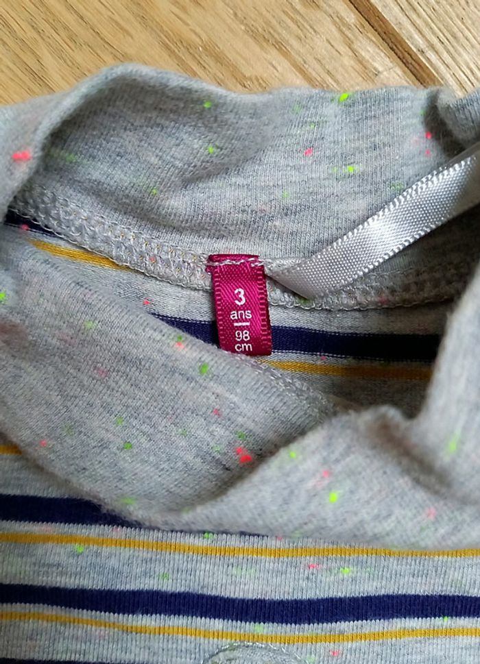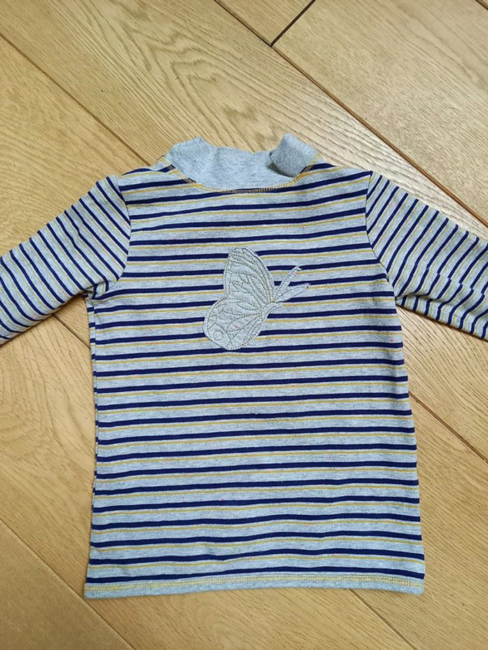Beau pull rayé avec papillon sur le devant. Très beau avec une jupe ou un short moutarde. Taille indiquée 3 ans # fille2anscanellemauve #fille3anscanellemauve