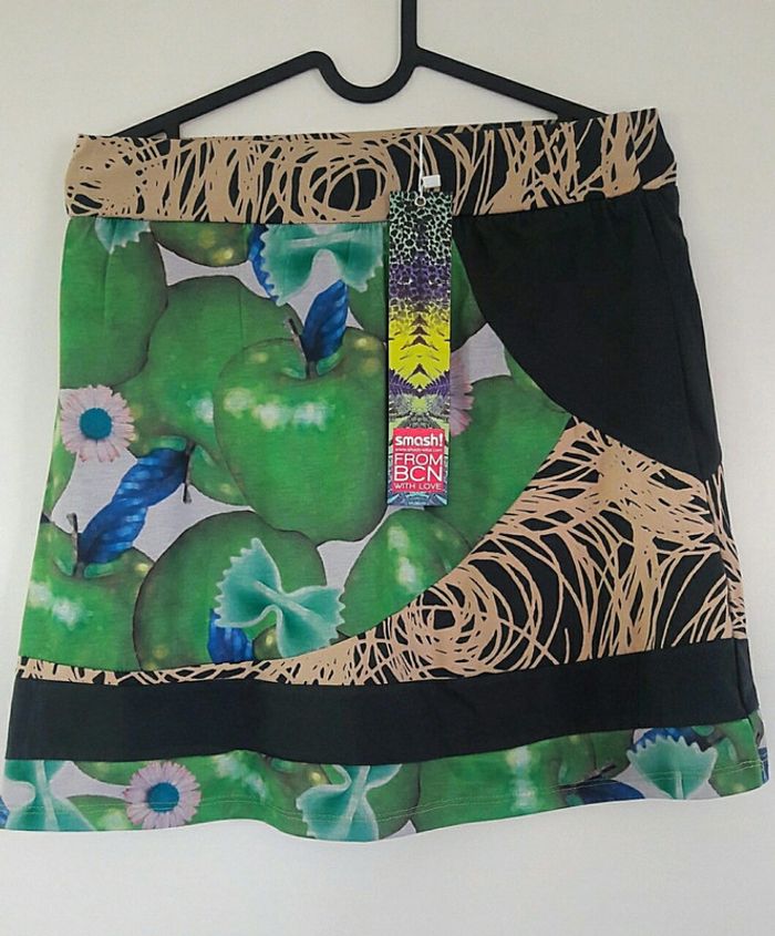 Magnifique jupe SMASH neuve. Motif pommes. Taille indiquée M mais selon moi plutôt du S. Largeur 36. Hauteur 44. #femmetaille36canellemauve #femmetaille38canellemauve