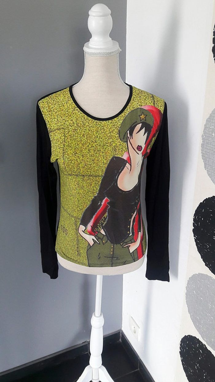 Beau tee shirt longues manches. Motif femme sur le devant, noir derrière. Pas de taille pour moi il s agit d un 38. #femmetaille38canellemauve