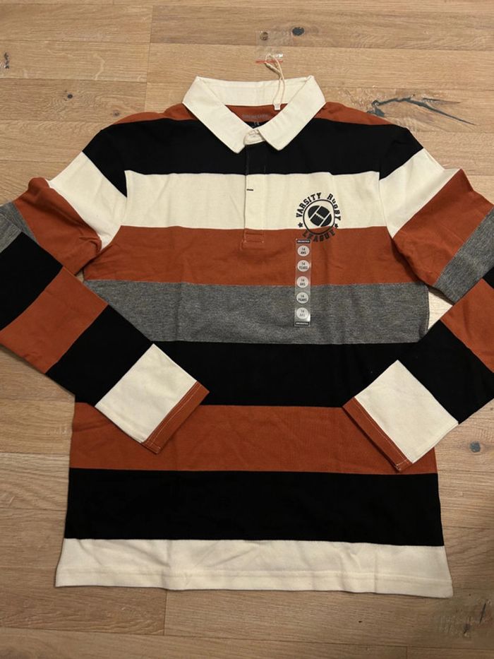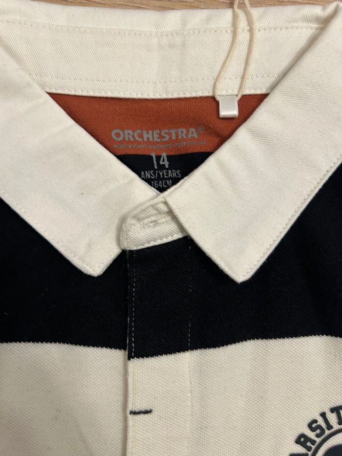 Polo manches longues en jersey piqué. Coloris variés effet color block. Col chemise contrasté en twill. Patte boutonnée en liquette sur le devant. Bouton imitation corne. Badge gomme fantaisie côté cœur. Surpiqûres contrastées à la base. Taille 14 ans Orchestra