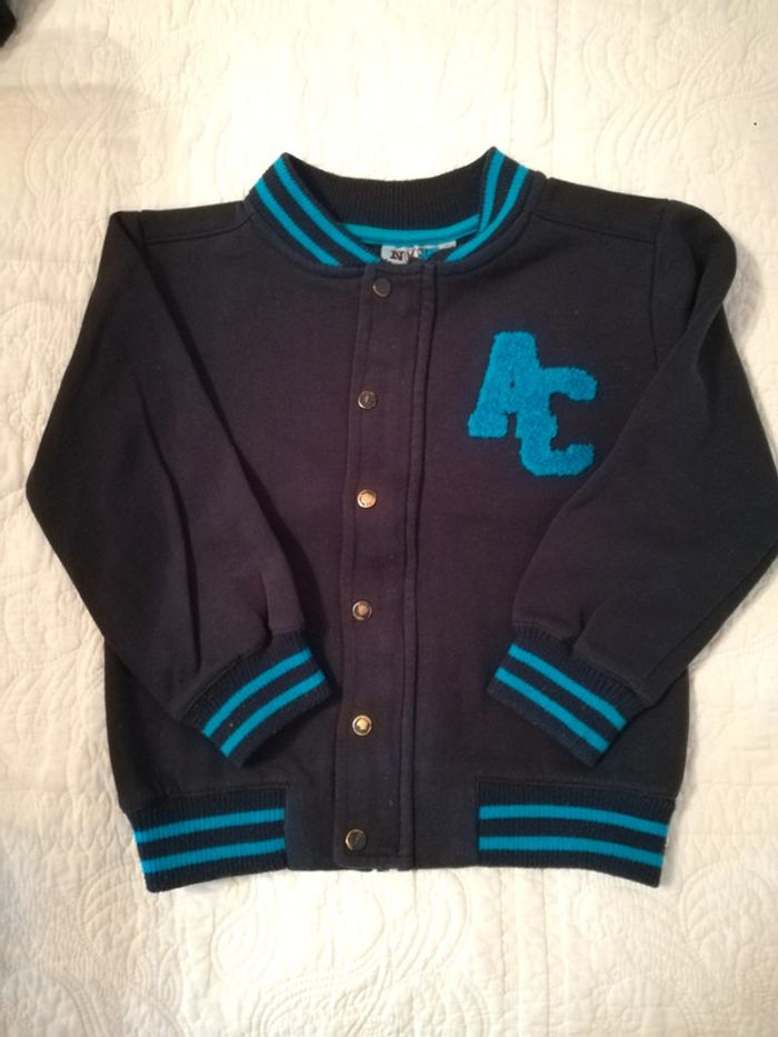 Sweat à pressions, esprit bombers. Marque NKY. Couleur bleu marine et turquoise. Bon état. Taille 6 ans.