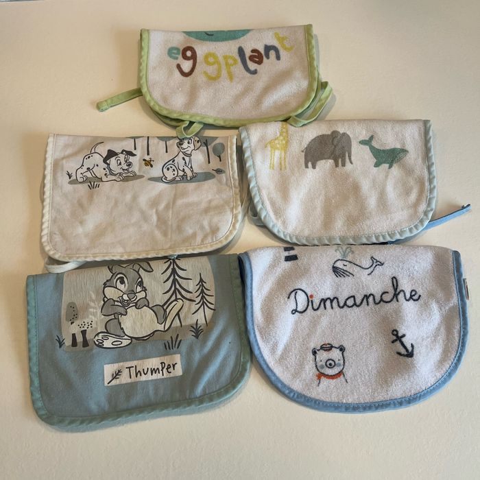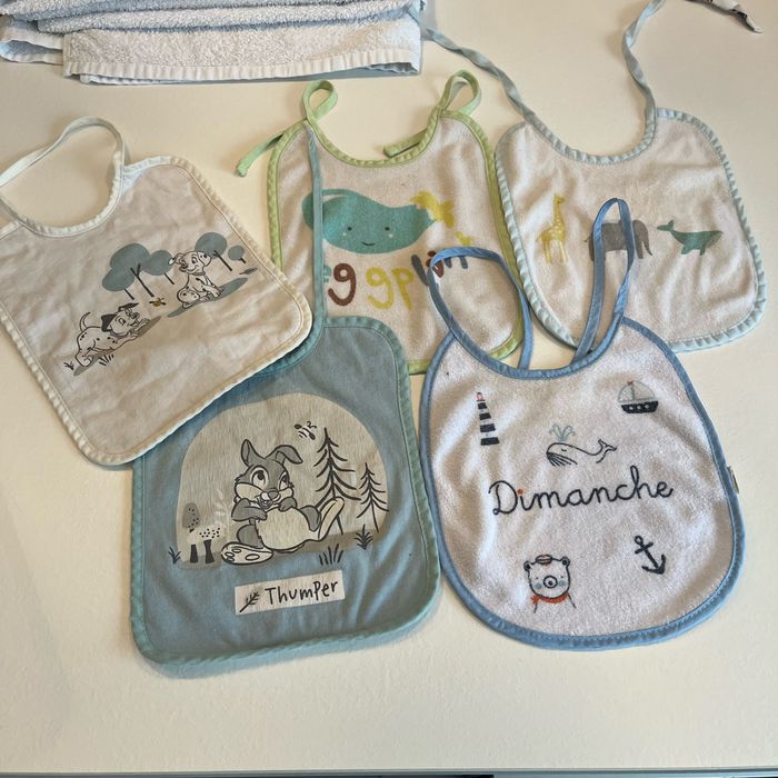 Lot de 5 bavoirs 0-3 mois de marques différentes disney mes petits cailloux… en bon état quelques micro taches mais très léger