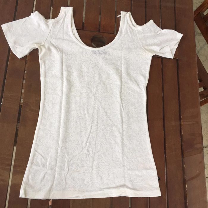 Vend haut blanc , épaule découvertes Motif dentelle blanche. Marque Bonobo. Taille XS Très bon état