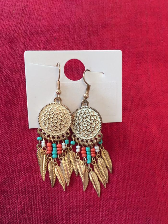Vend boucles d’oreilles en forme d’attrape Reves. Couleur rouge et bleu et blanc Plumes dorée. Très bon état car porté qu’une seule fois.