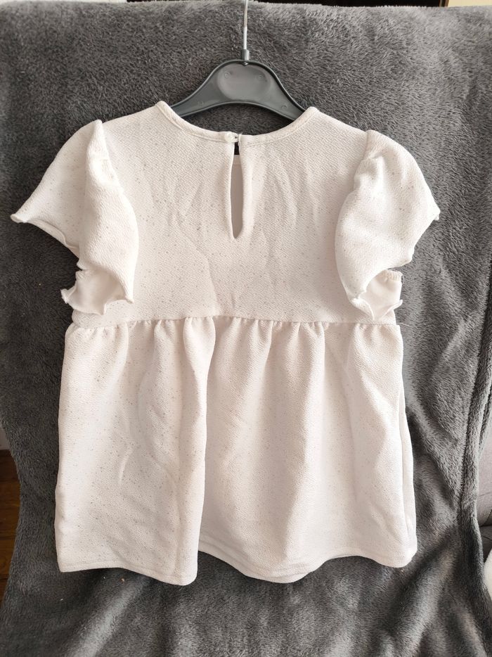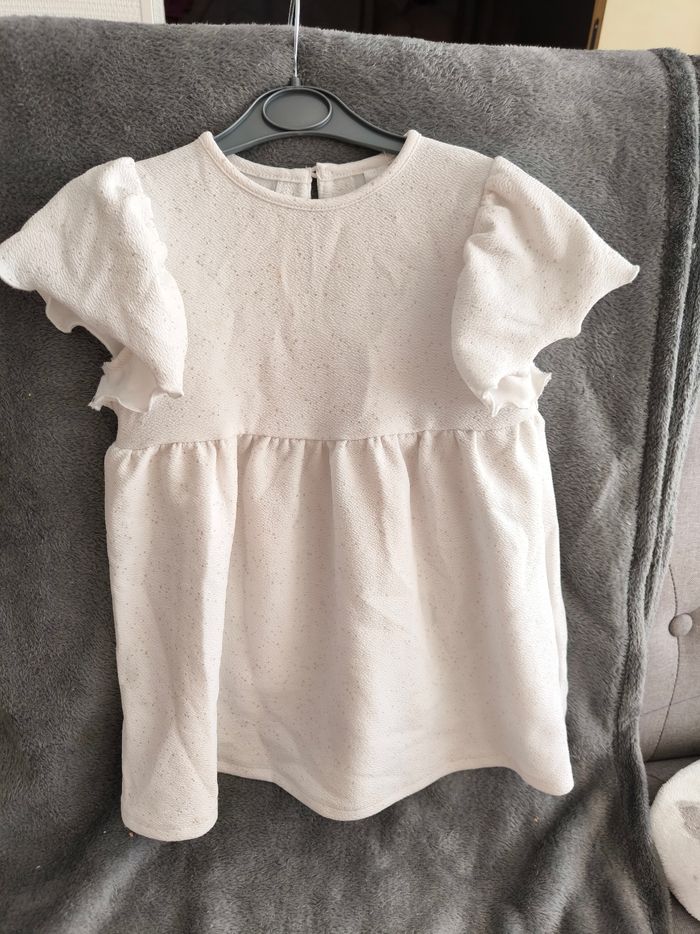 Robe petite fille taille 36 mois On dirait qu'elle est blanche mais elle est couleur blanc cassé ( j'ai mis couleur crème car il n'y a pas le choix pour blanc cassé). Elle a des petits points dorés. Une petite tâche sur le devant de la robe. Voir photo.