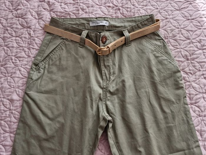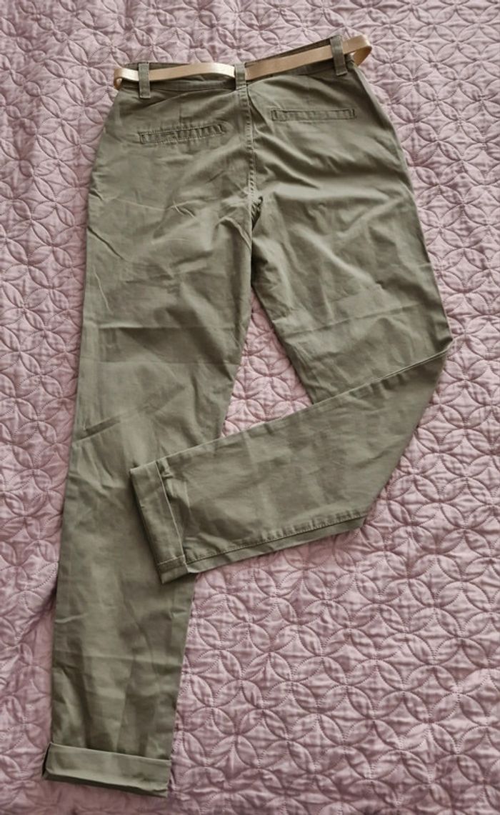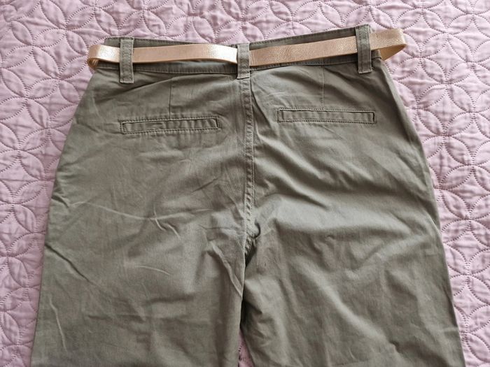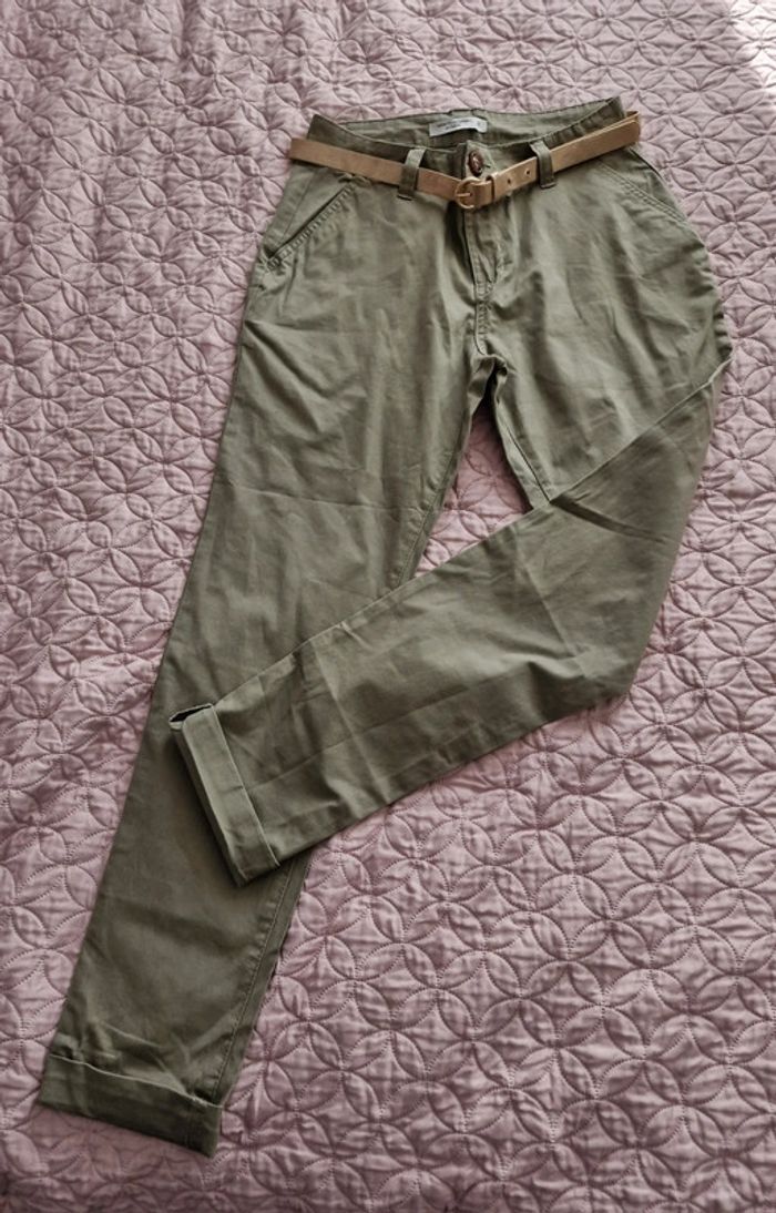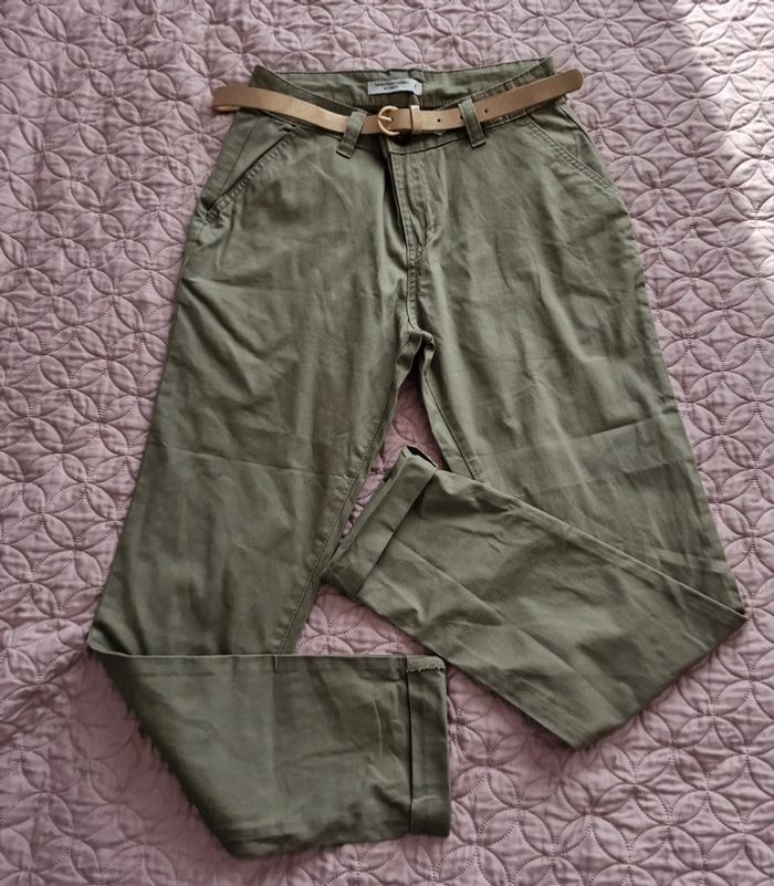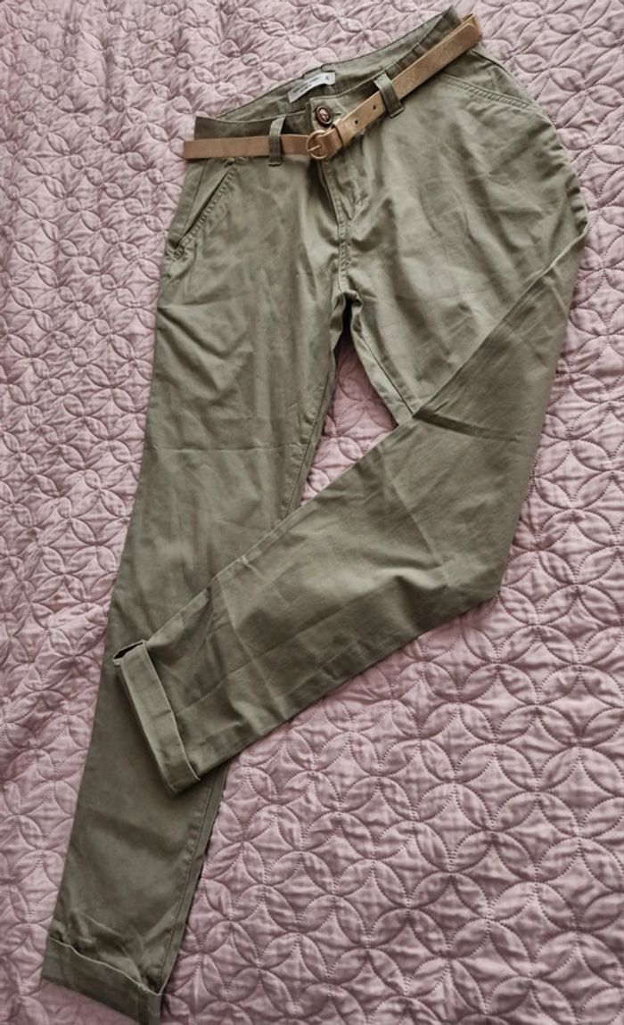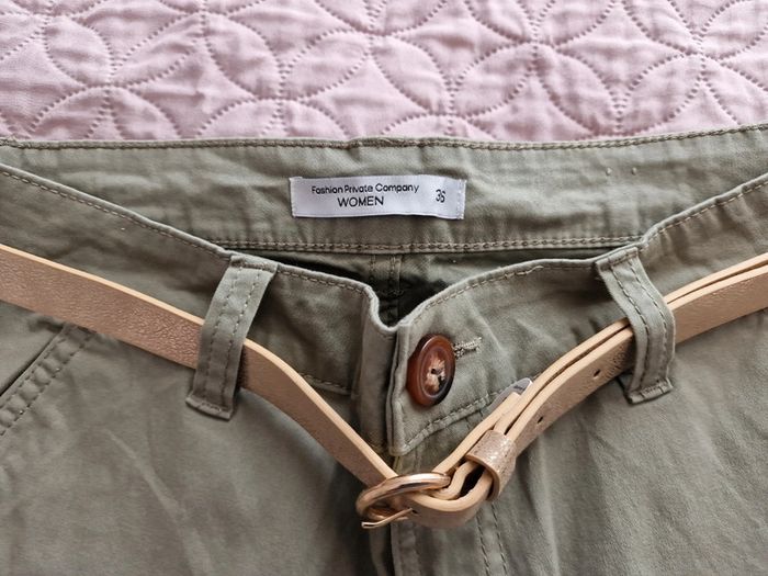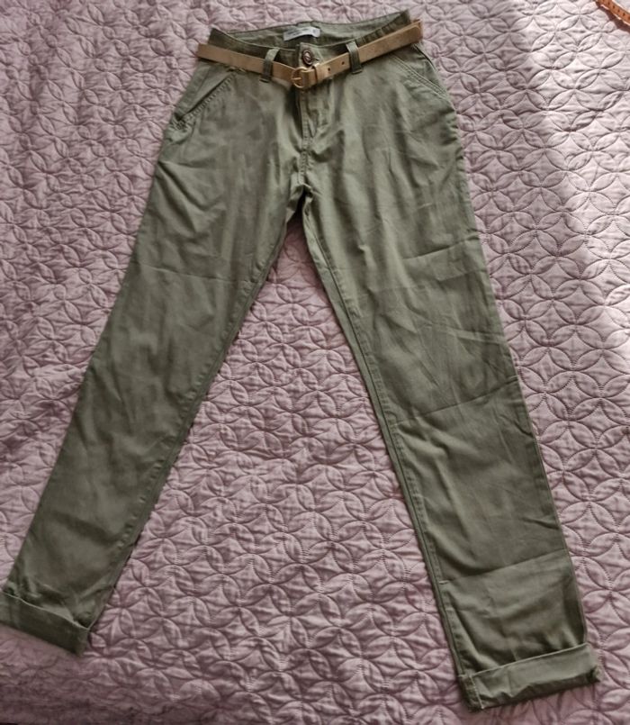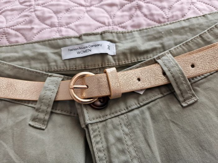 Pantalon chino femme kaki avec ceinture doré FASHION PRIVATE COMPANY Women Taille 36cm, hanches 49cm longueur 102cm dans le bord.
