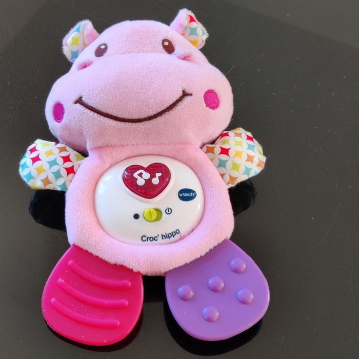 Un copain tout doux à câliner et une veilleuse musicale et lumineuse pour accompagner bébé au pays des songes. Un bouton «coeur» lumineux déclenche de douces phrases, chansons et mélodies et clignote au rythme de la musique. Ses pattes souples à mordiller soulagent les gencives et apaisent les poussées dentaires de bébé