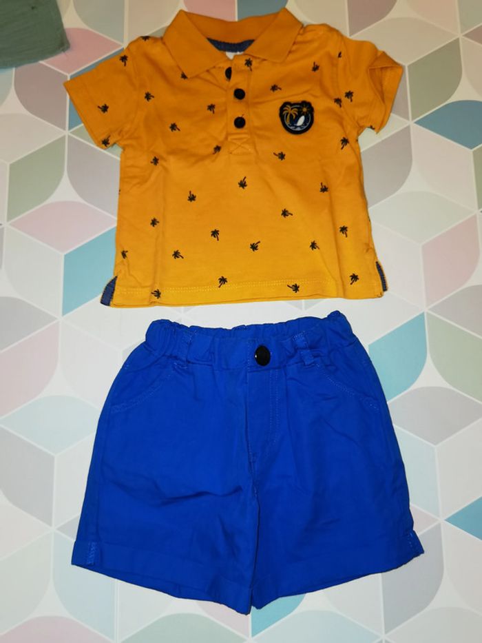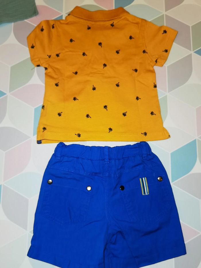 ensemble composé d'un polo moutarde et d'un short bleu #labourseo80_garçon3mois N'hésitez pas à me contacter pour des achats multiples