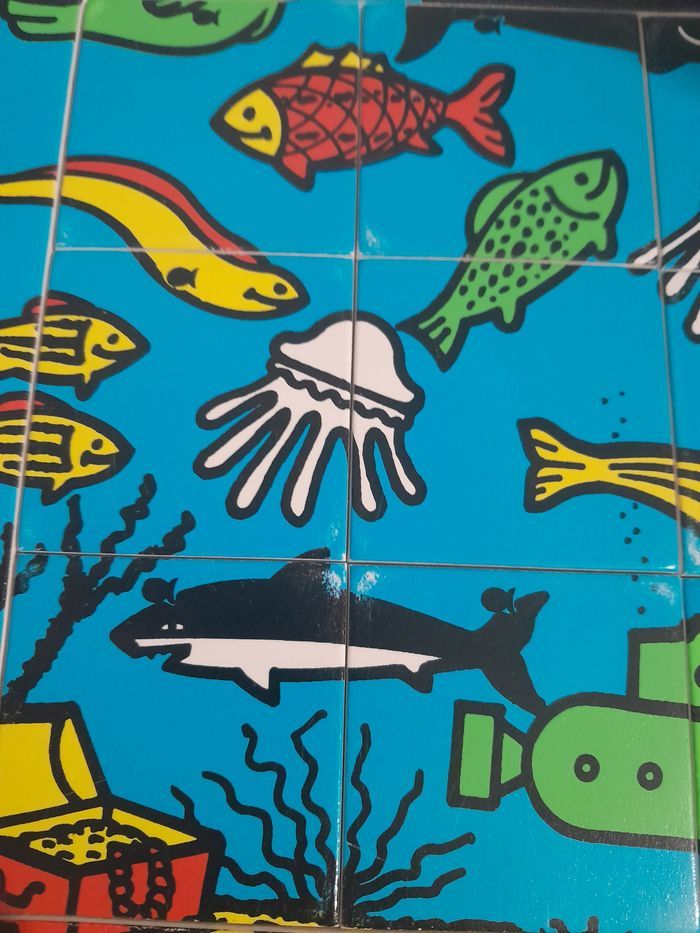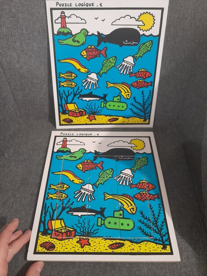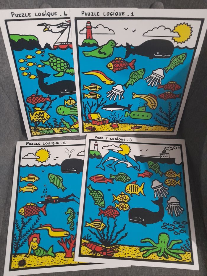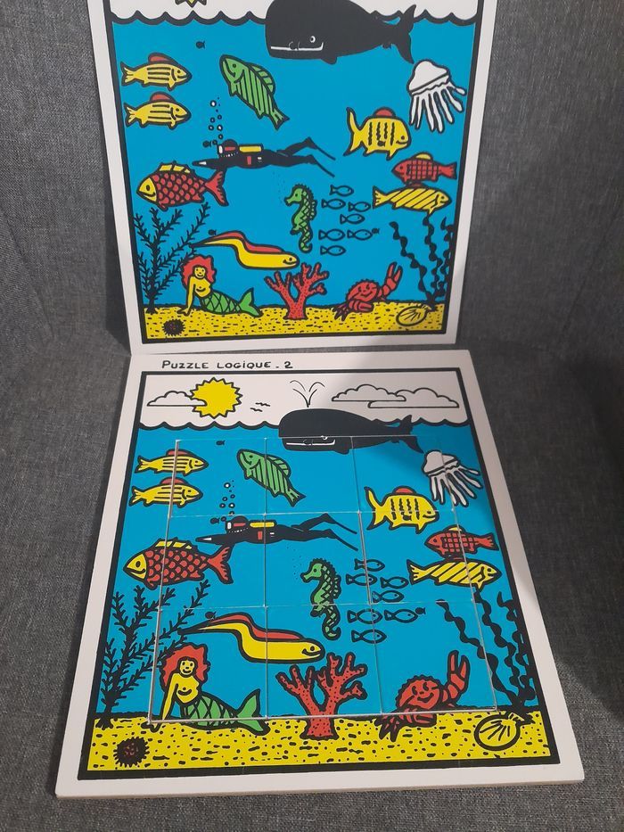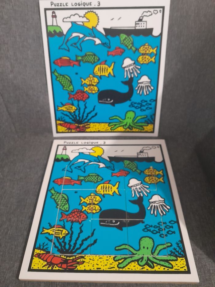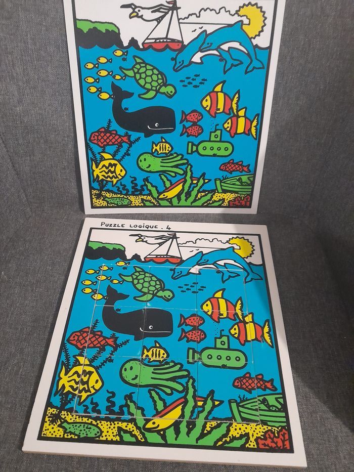 4 puzzles logiques sur le thème de la mer puzzles en bois, modèle en plastique matériel scolaire genre édition du grand cerf je n'ai plus la mallette bon état (voir photos pour les petits défauts)