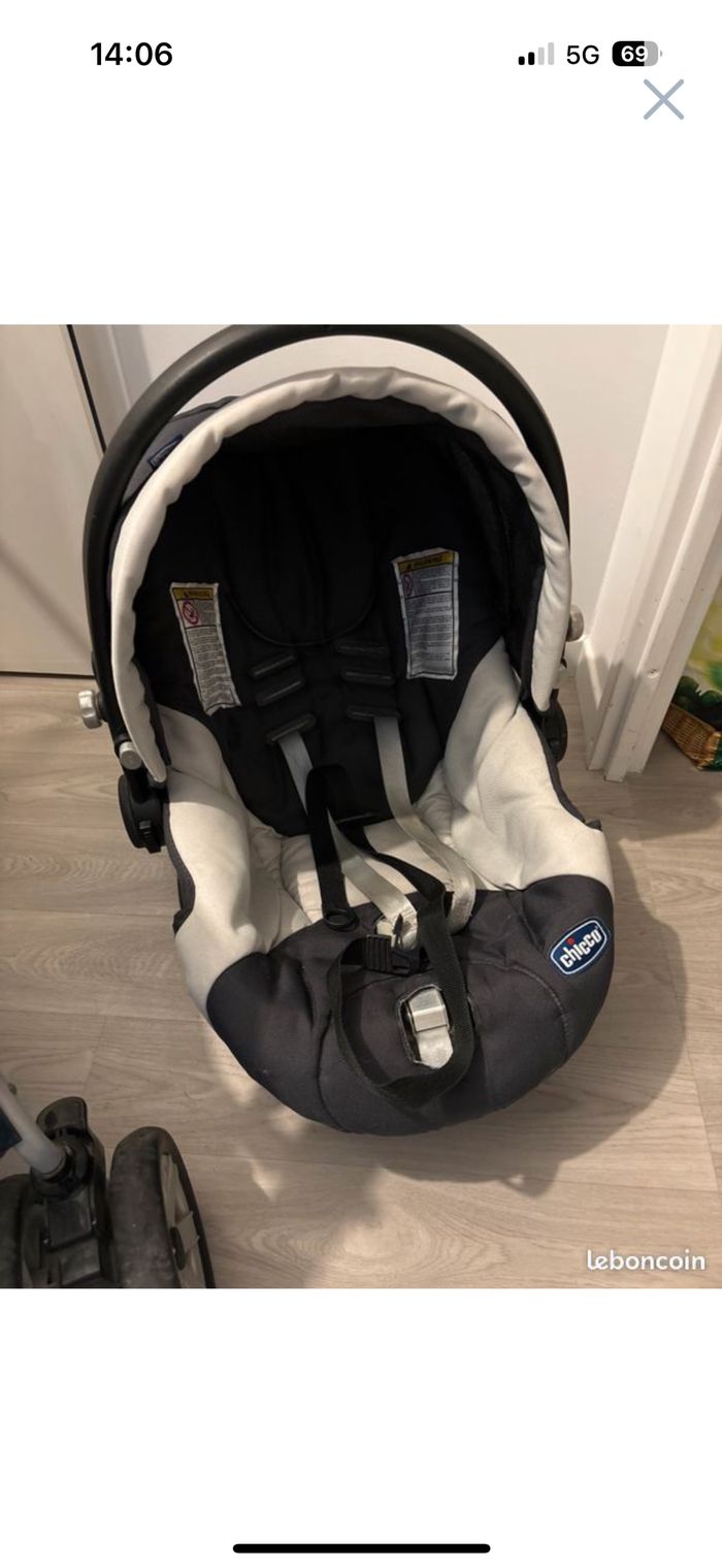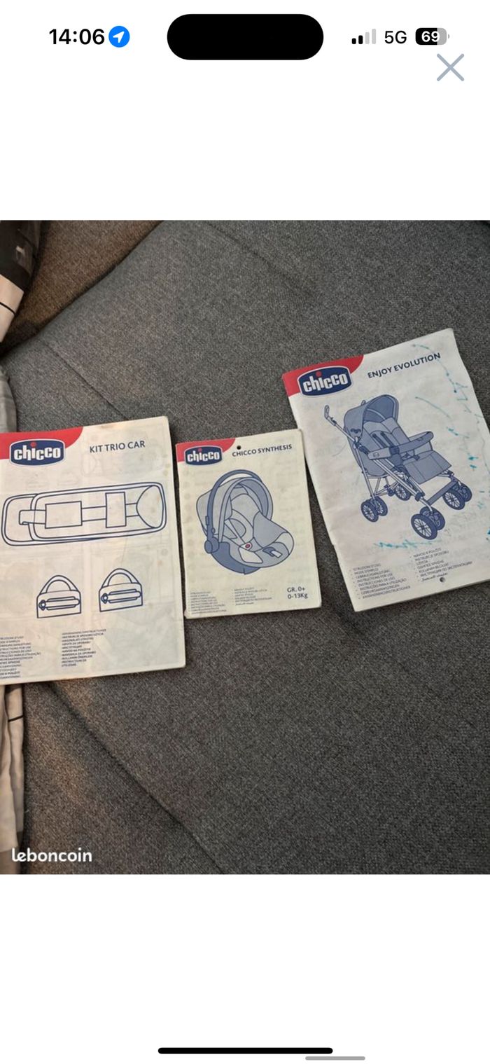 Vends poussette chico trio, avec notice et 2 alaise supplémentaire À relaver, j’ai tout démonté et laver mais étant stocker depuis 2020, il y a une odeur de renfermé. Poussette cane, cosy et nacelle