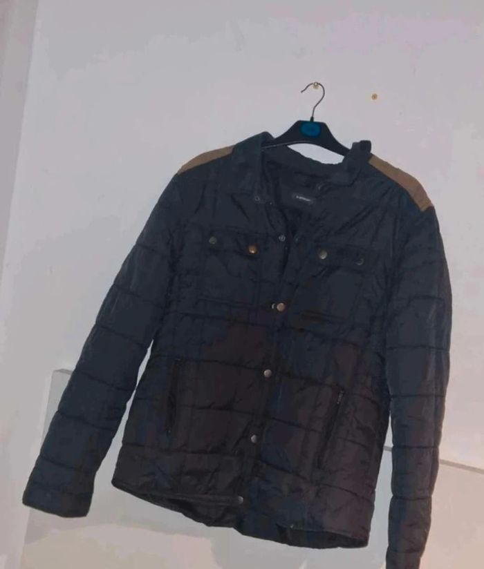Manteau homme Bleu marine et épaulettes en daim marron Taille L In extenso Très bon état