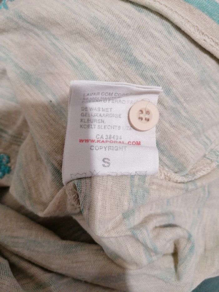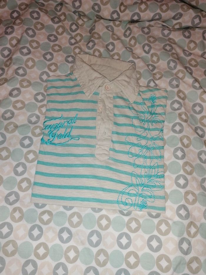 T-shirt style polo beige et turquoise. Pas mal porté Un peu détendu sur le bas