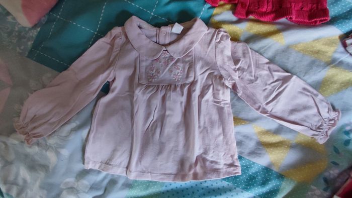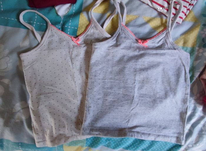 Le lot comprend: - Un gilet (Le phare de la baleine). - Deux débardeurs (Kiabi ou Gémo). - Un tee-shirts manches longues (Babilou). - Deux tee-shirts manches longues avec col et autre avec col roulé (Tex et Kiabi). - Quatre leggins (Primark, Lupilu, Tisaia). Bon état général, juste un petit trou sur l'un des leggins qui peut être recousu avant envoi (voir photo).