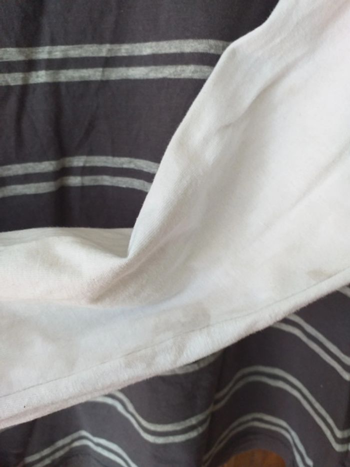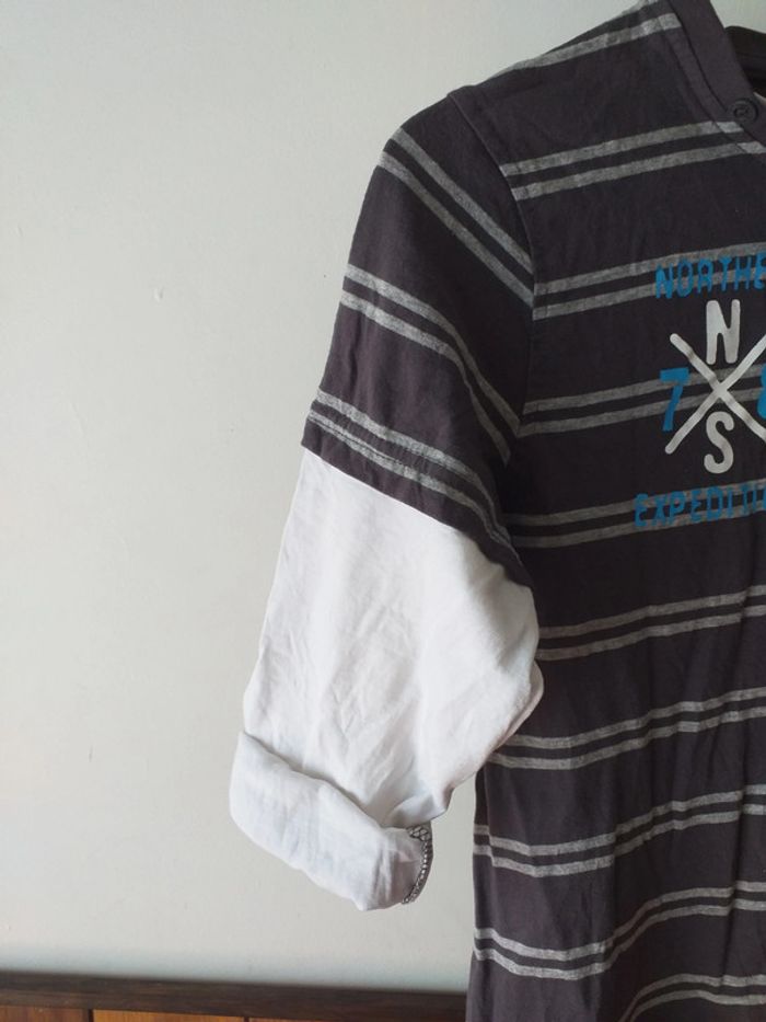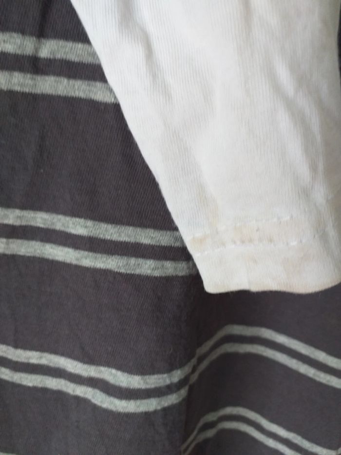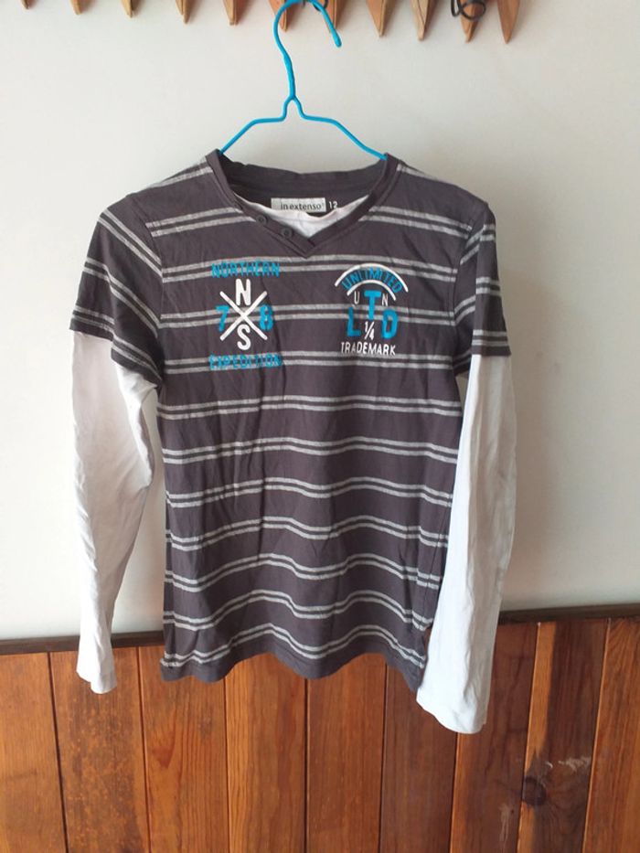 Tee-shirt manches longues rayé il y a des tâches aux 2 manches à porter retourné. Peut être donner si achat d'un lot . #bakeco12ansgarçon