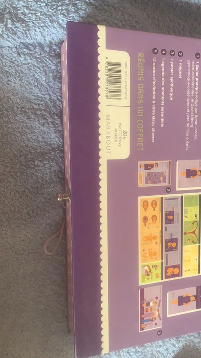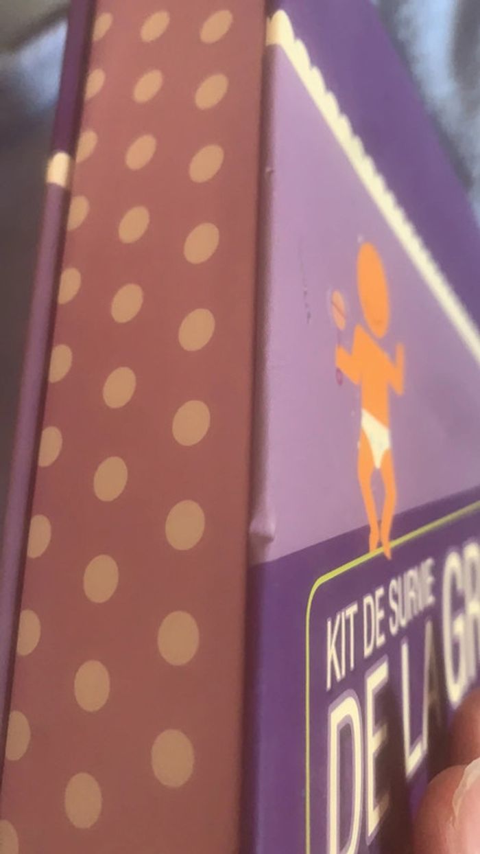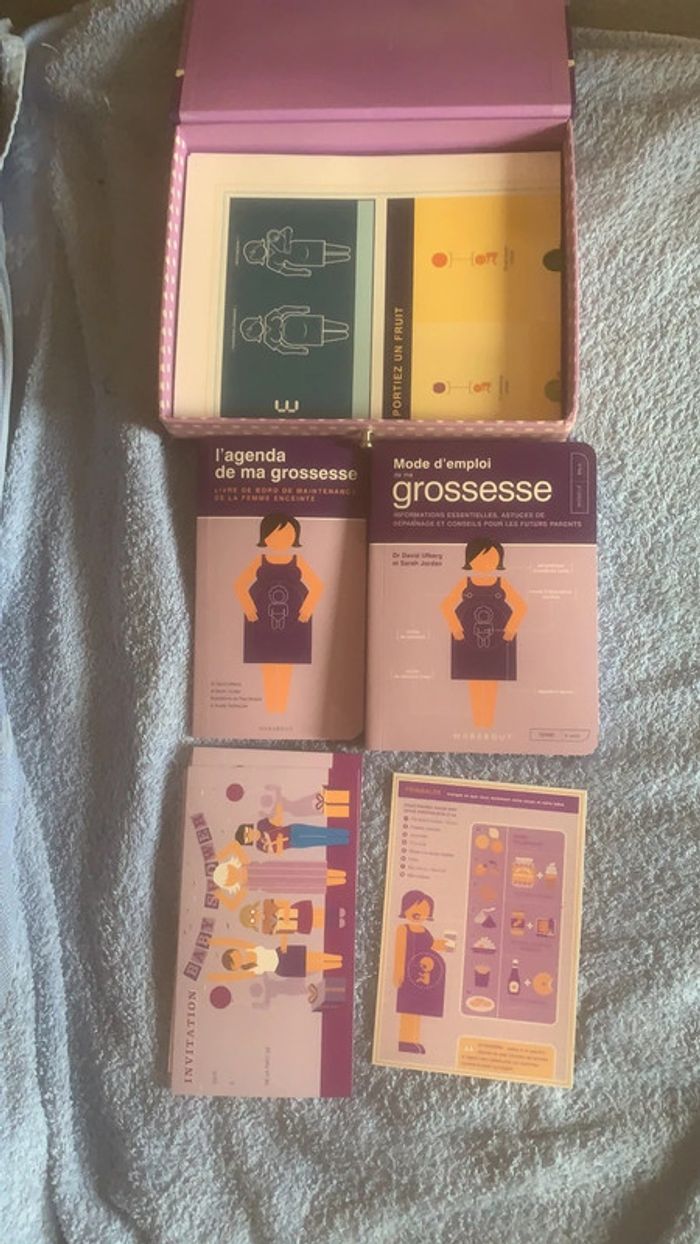 Kit de survie de la grossesse -mode d’emploi grossesse -agenda -poster -12 cartes invitation baby shower -1 magnet Livre d’astuces pour que bébé fasse ses nuits. Le tout en en très bon état, la boîte du kit est un peu abîmée mais intérieur nickel.
