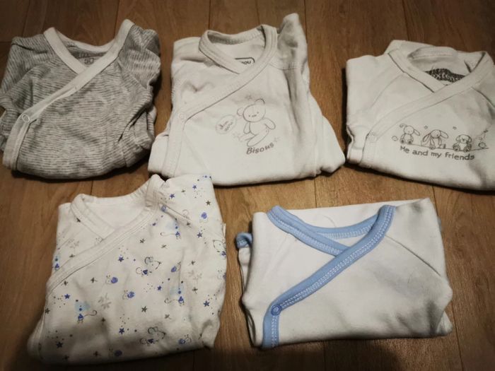 Lot de 5 bodys naissance manches longues. Ouverture sur le devant. Ont été portés mais reste en bon état. Plusieurs marques : in extenso, ptit bisou, auchan et 1 je ne sais pas. Pas de tâche ni trou. Pressions ok. #or_et_litgarconnaissance