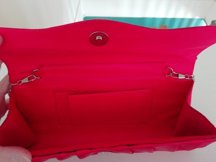 Pochette de soirée rouge. Utilisée une seule fois. Excellent état. Seule la sangle en métal a quelques points de rouille. Elle peut etre changée sans aucune difficulté. Cf photos