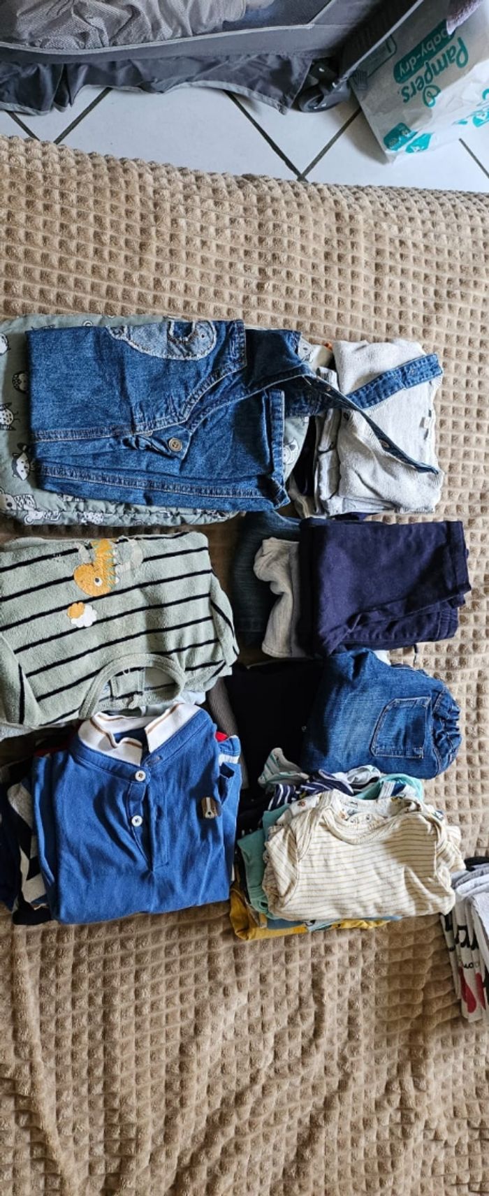 13 bodies 4 tee shirt 1 gilet 8 pull/ sous pull 7 pantalons 1 salopette en jean 3 pyjamas plus un pyjama chauve souris 1 gigoteuse