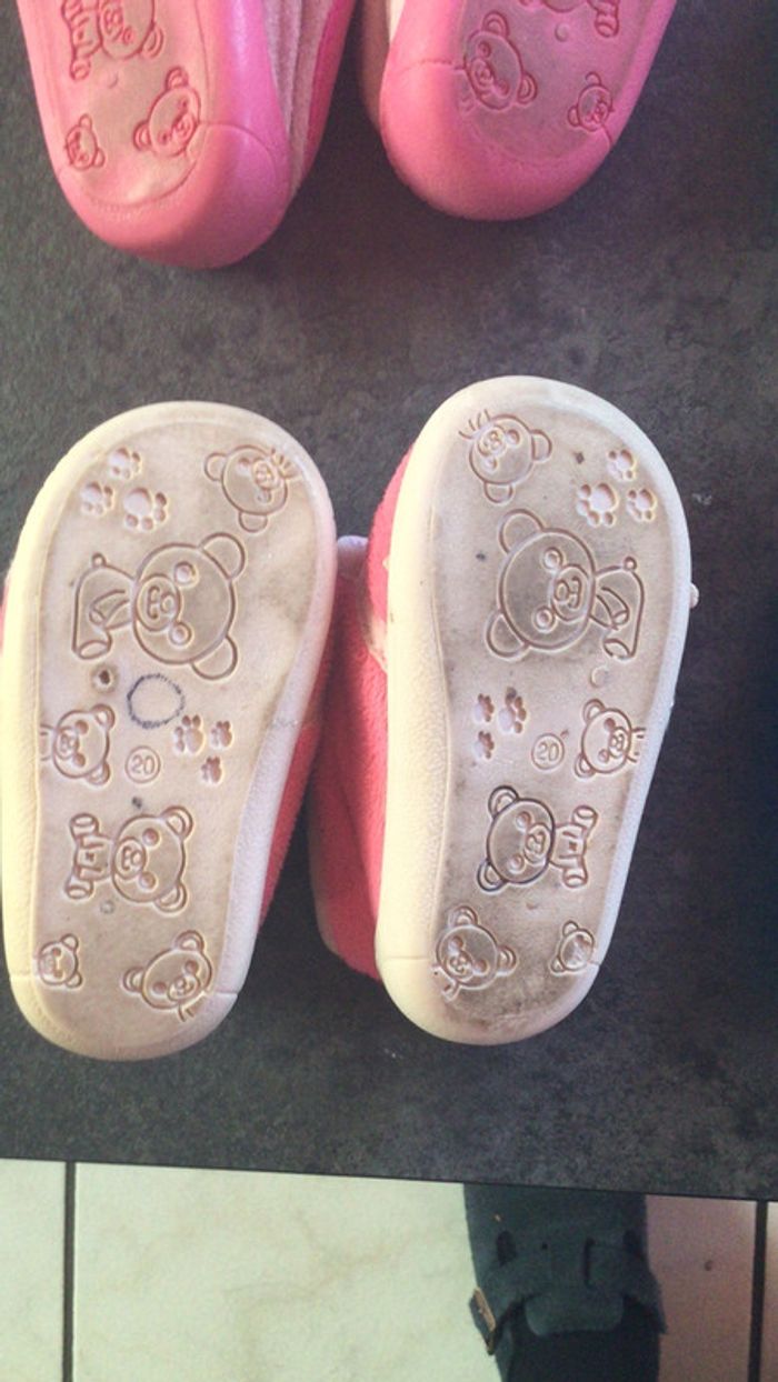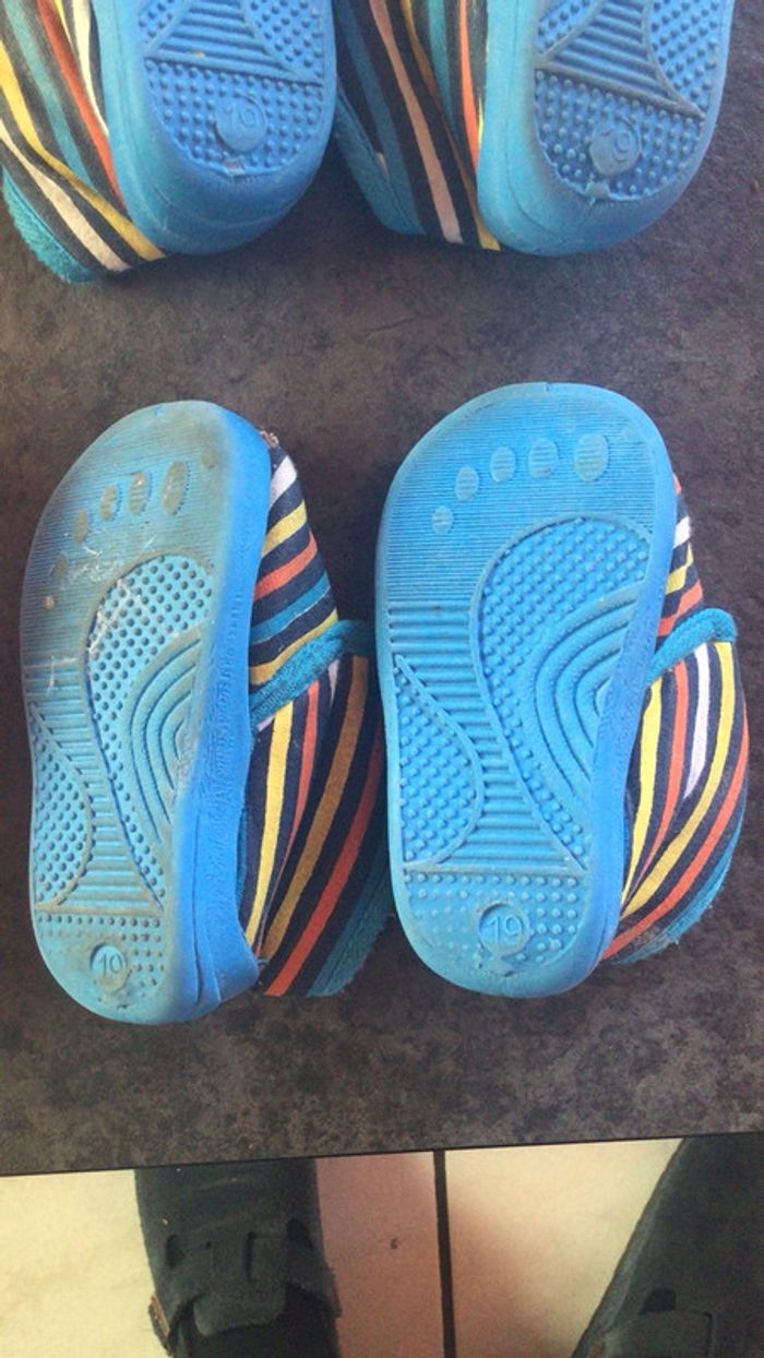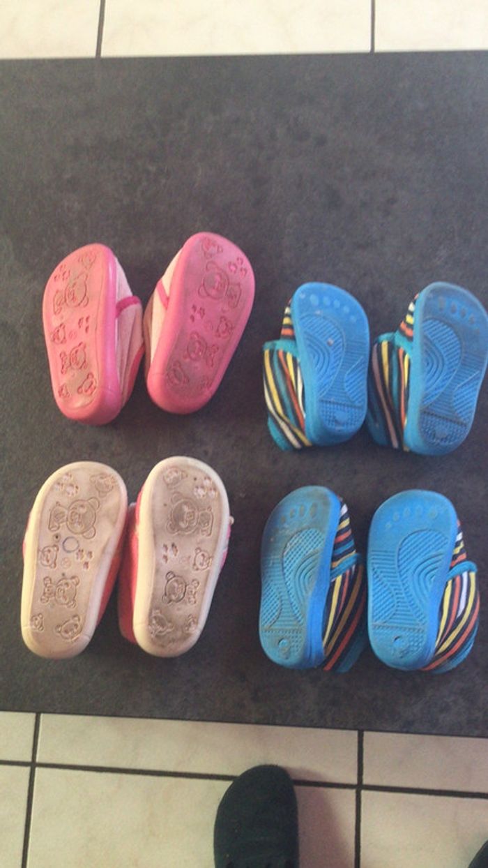lot de 4 pantoufles : - 2 paires taille 19 (les bleues) : orchestra - 1 paire taille 20 (les roses foncées) : marque auchan - 1 paire taille 21 (les roses claires) : marque auchan