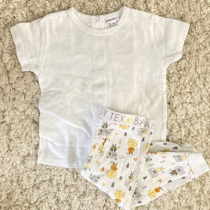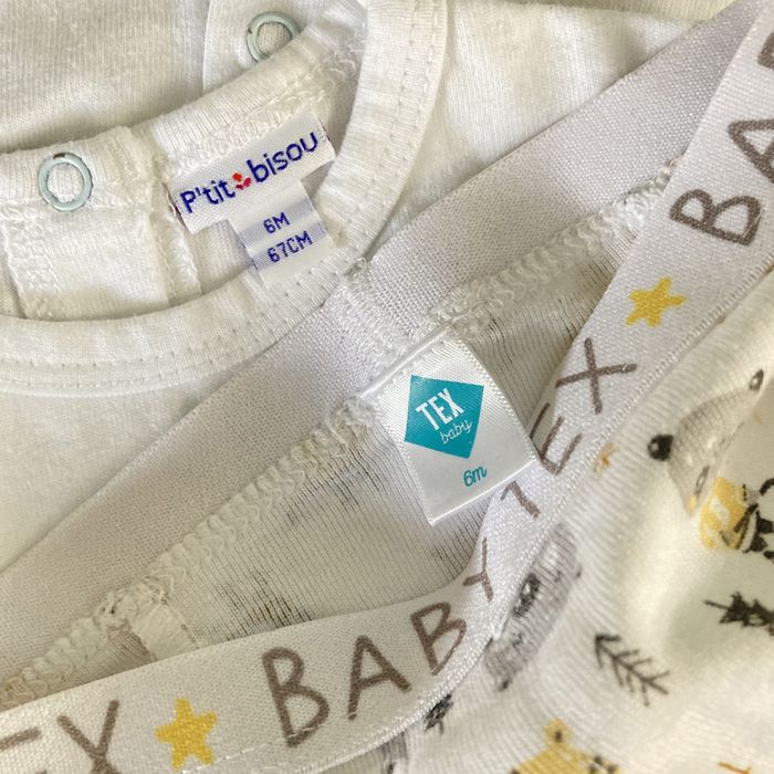 Ensemble bébé / Marque P'TIT BISOU + TEX / Très bon état / Taille 6 mois : T-shirt P'TIT BISOU 6 mois coloris blanc, manches courtes, col rond, pressions tout le long du dos. + Pantalon TEX 6 mois coloris blanc imprimé petits personnages ton beige/gris. Taille et bas de jambe élastiqués. 100% coton. Ni reprise, ni échange #denicheurdepetitsbonheursbebe #denicheurdepetitsbonheurstaille6mois #denicheurdepetitsbonheurstex #denicheurdepetitsbonheursptitbisou #denicheurdepetitsbonheurstshirts #denicheurdepetitsbonheurspantalons #denicheurdepetitsbonheursensembles #ptitbisou #tex #bebe #ensemblebebe #ensembletshirtpantalon #tshirtptitbisou #pantalontex #taille6mois #bebe6mois #lot6mois
