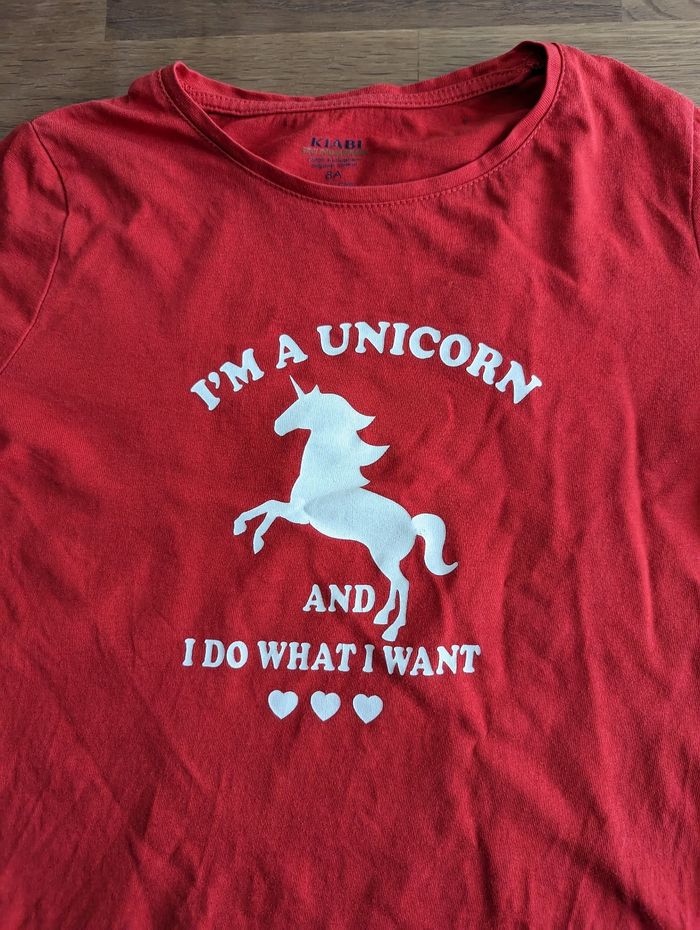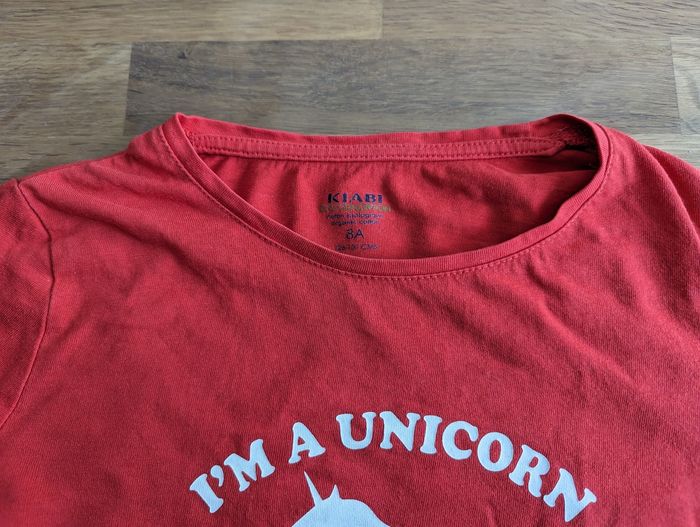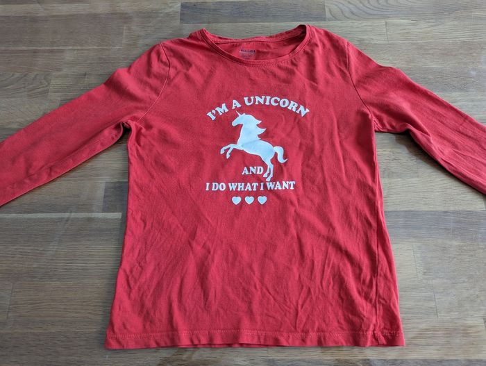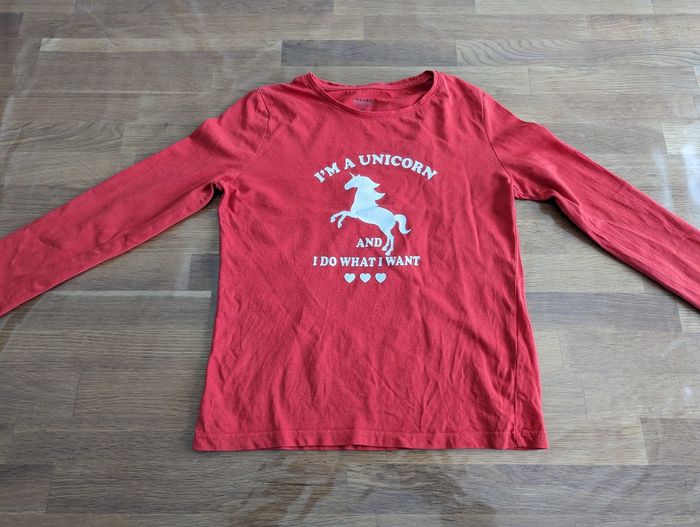 T-shirt avec licorne 🦄 fille 8 ans Kiabi Bon état, de petites bouloches commencent à apparaître, une trace atténuée dans le dos. Coton biologique, rouge et blanc, licorne
