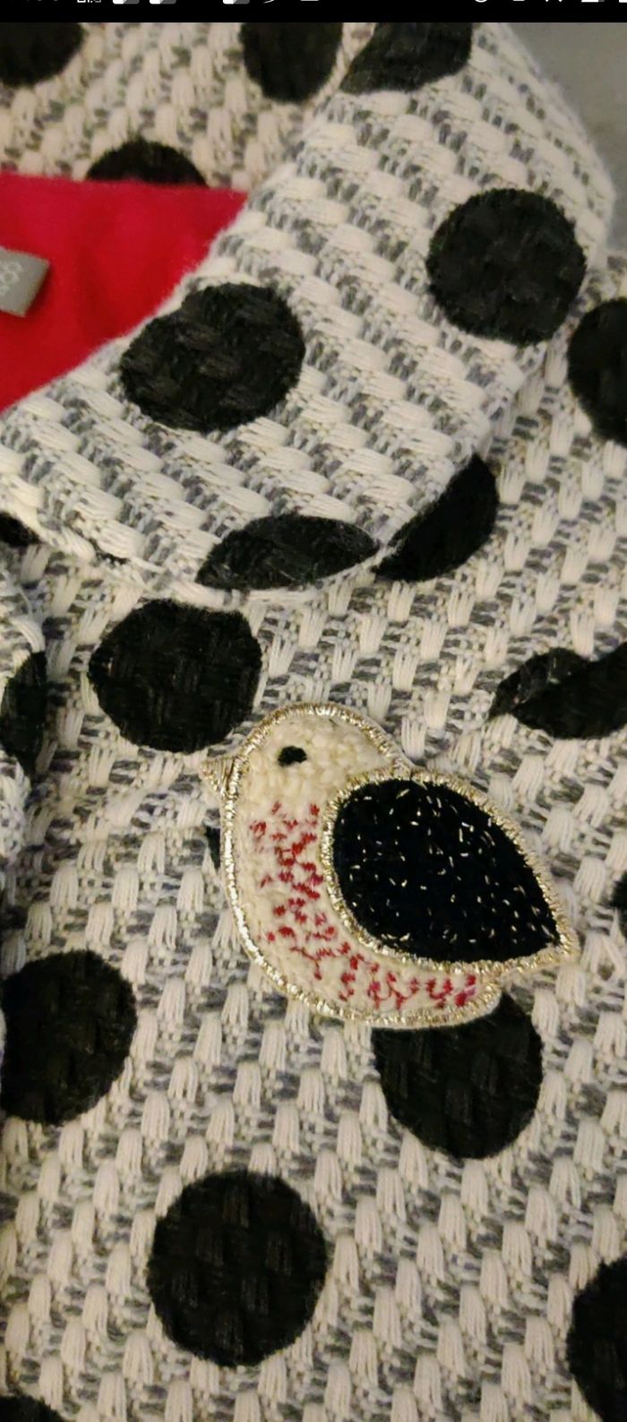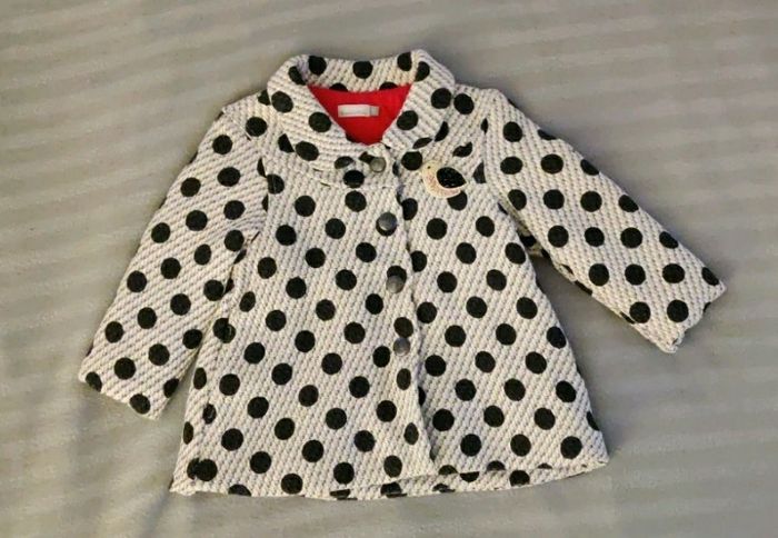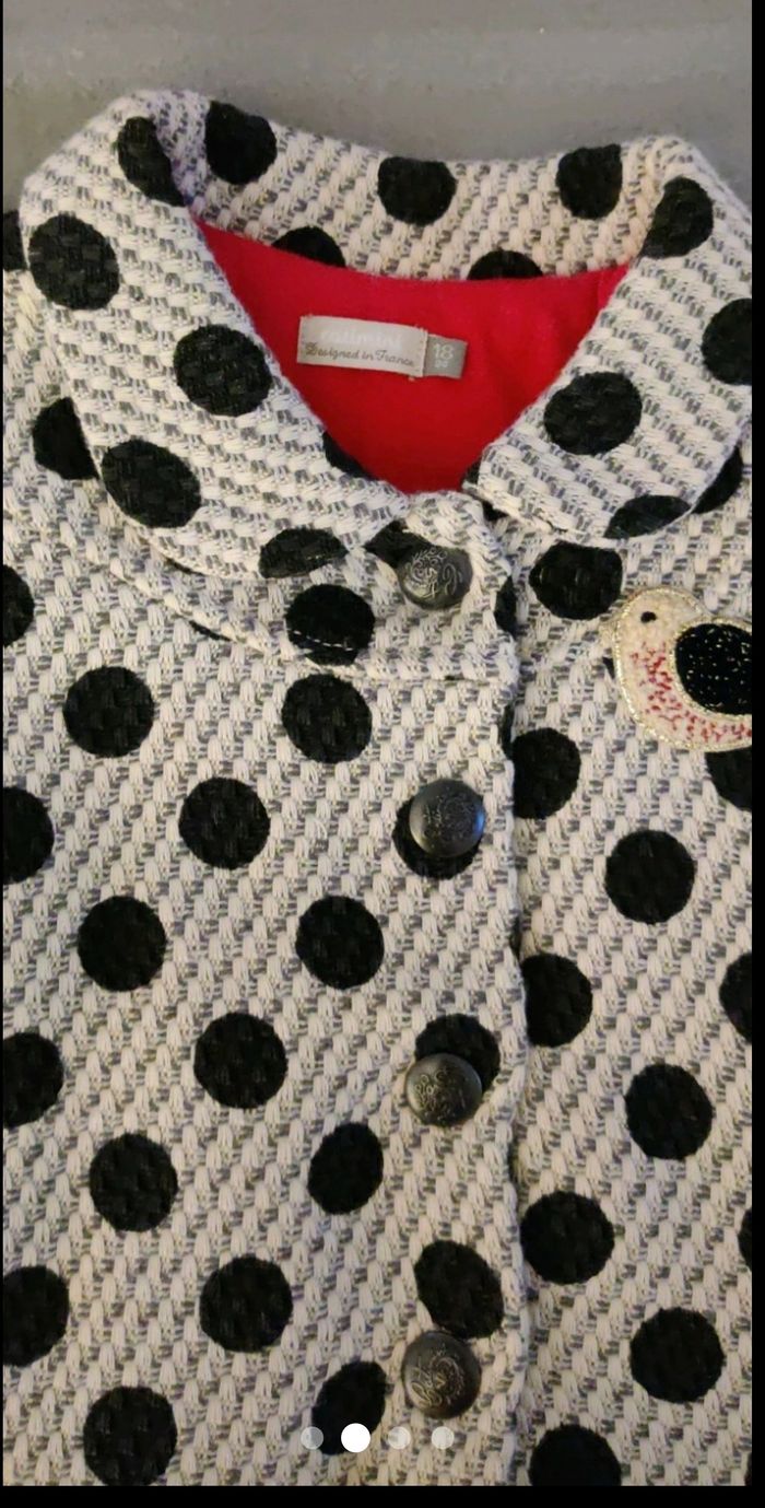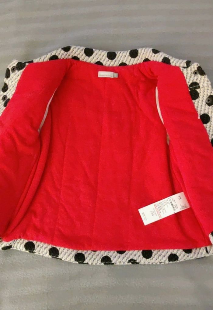 Magnifique manteau taille 18 mois Catimini gris à pois noirs, avec un oiseau en broderie. Intérieur coton rouge. Comme neuf ! Il n'a été porté qu'une seule fois.