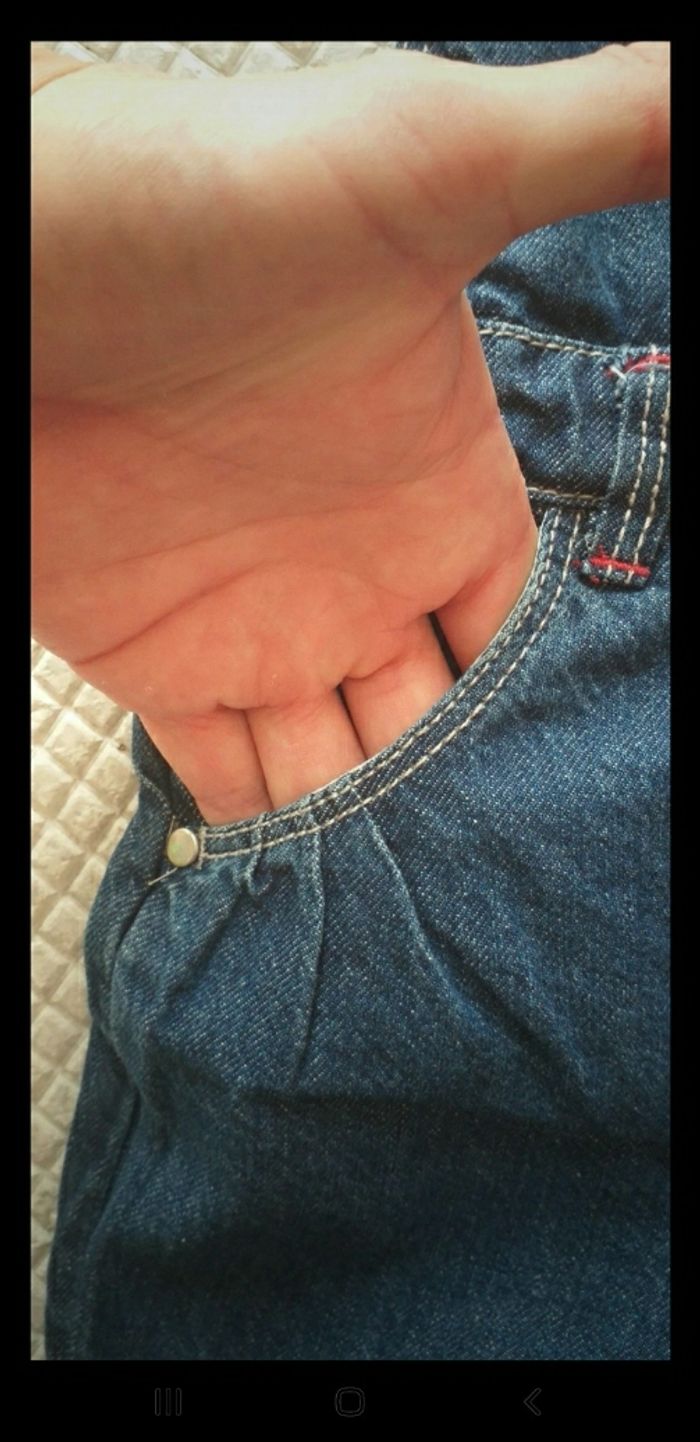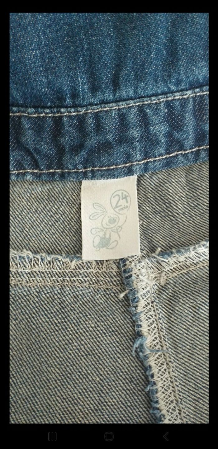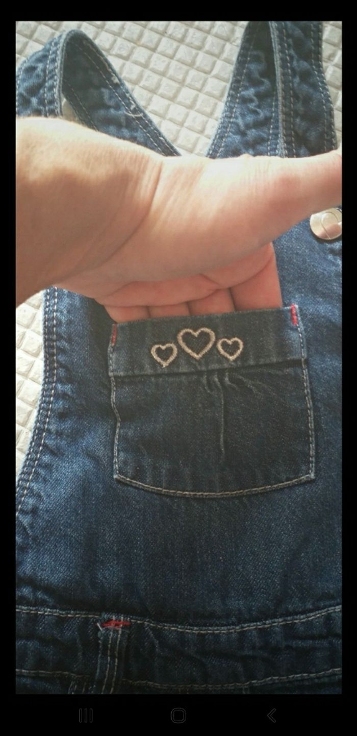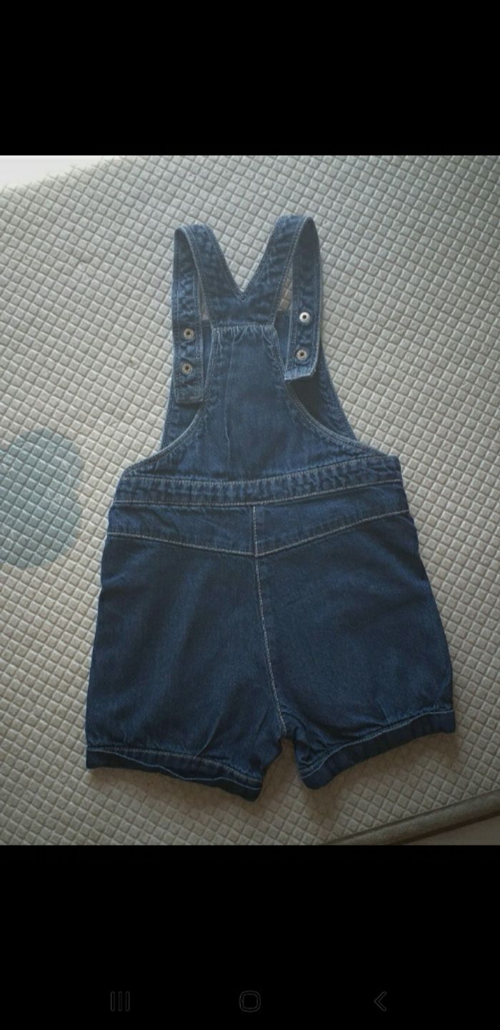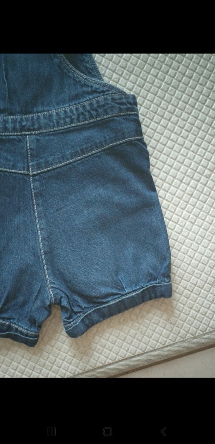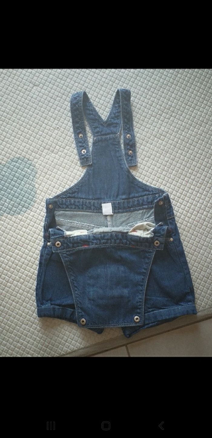 Salopette short en jeans. Poches devant. Fermeture par boutons pressions au niveau des épaules et de la taille.
