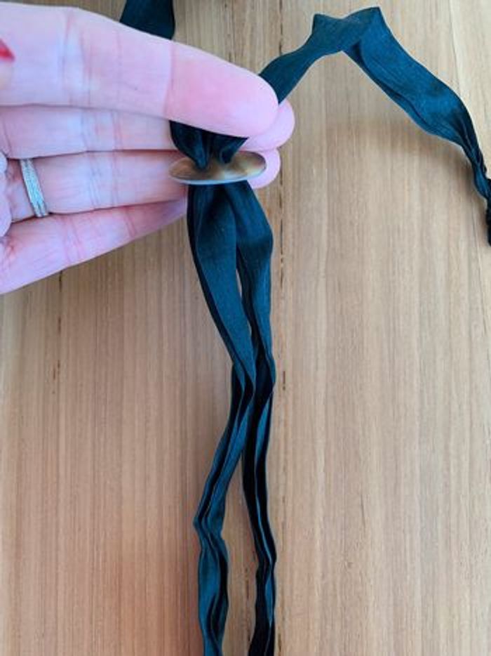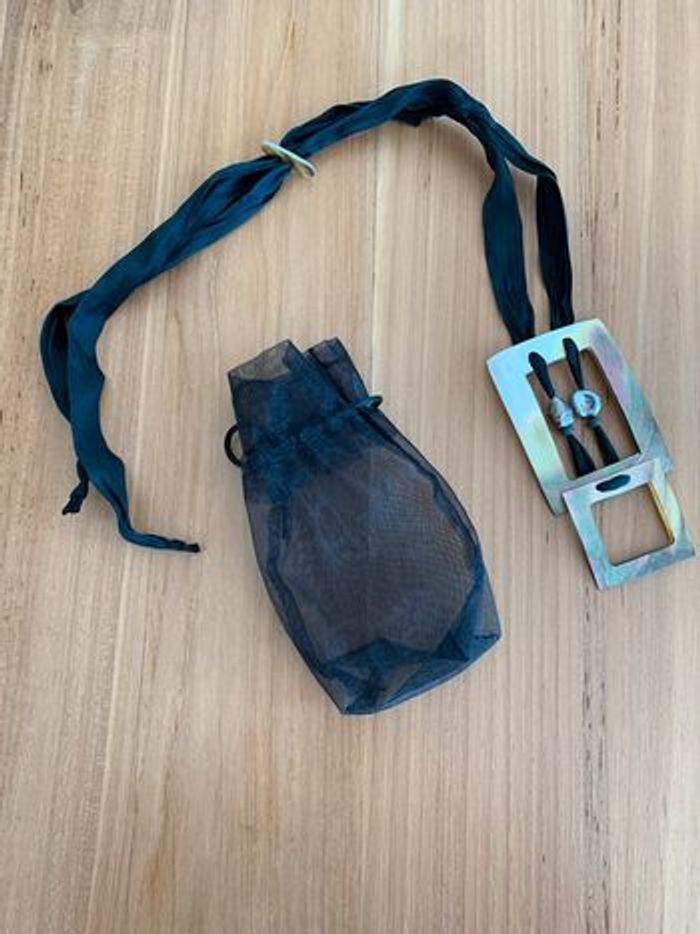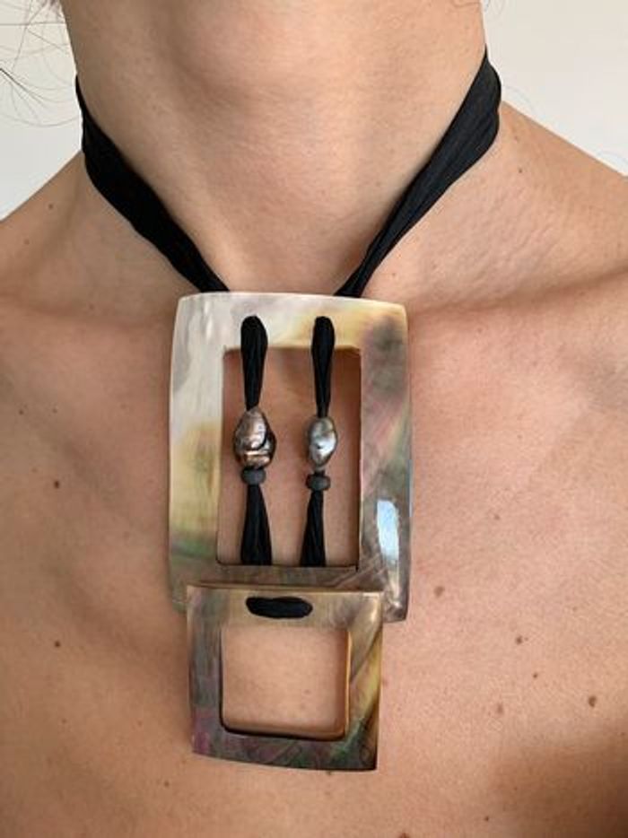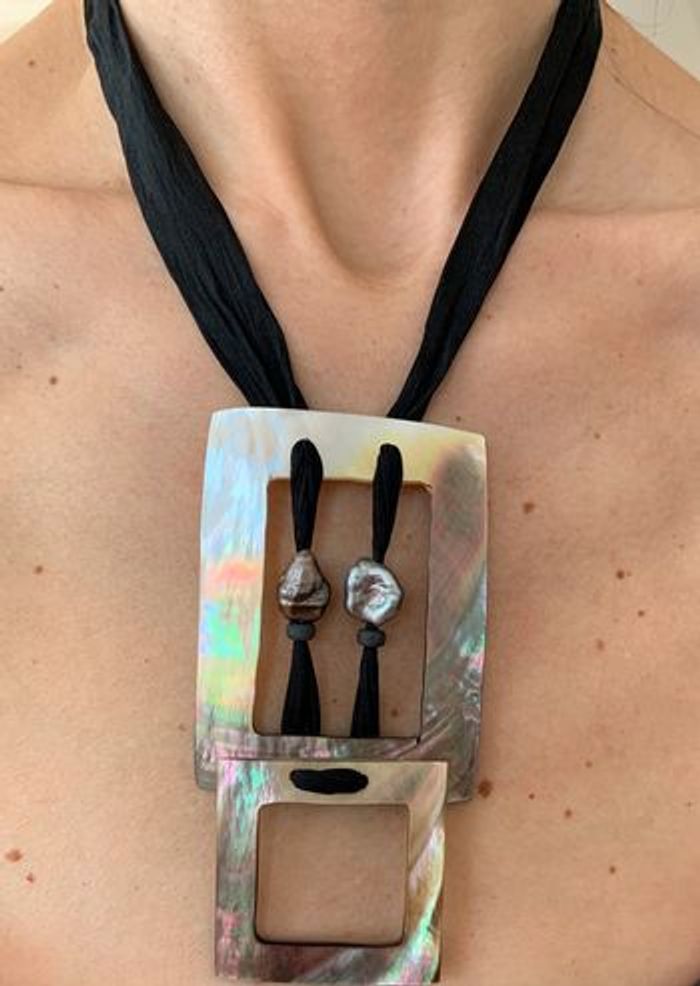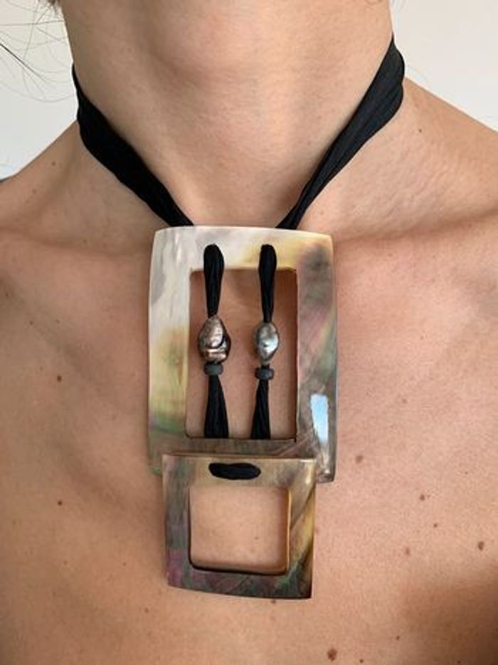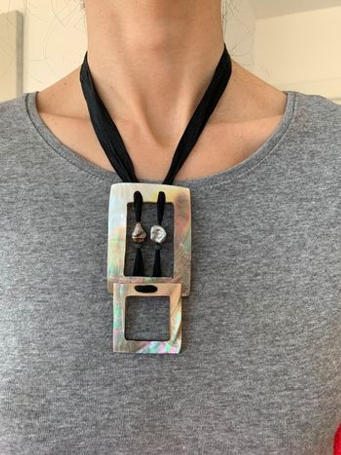Création Pendentif Véritable Nacre de Tahiti monté sur un ruban en soie. Réglable. Acheté en Polynésie. En excellent état.