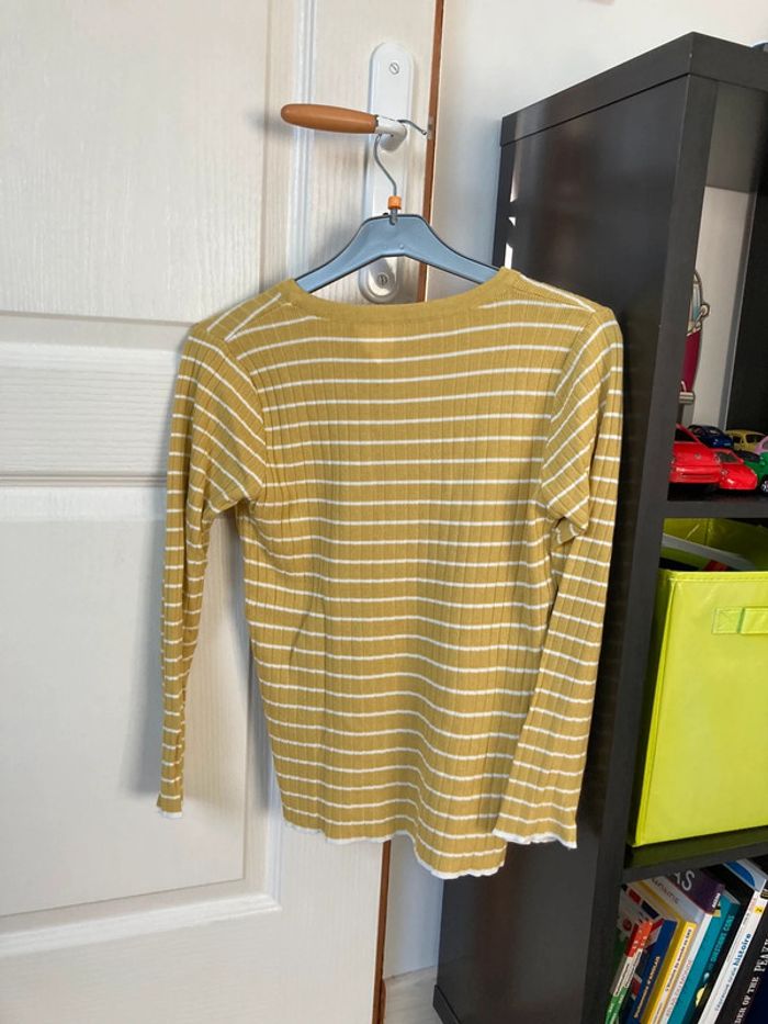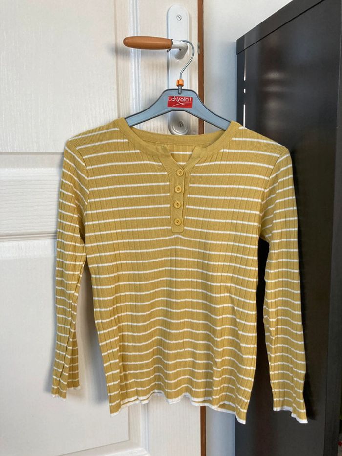 Pull fin vintage à rayures jaunes et blancs Col V avec boutons Taille 38 En très bon état