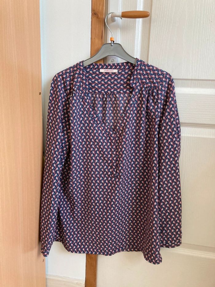 Blouse manches longues col V à motifs bleus et rouges Camaieu taille 40 En très bon état