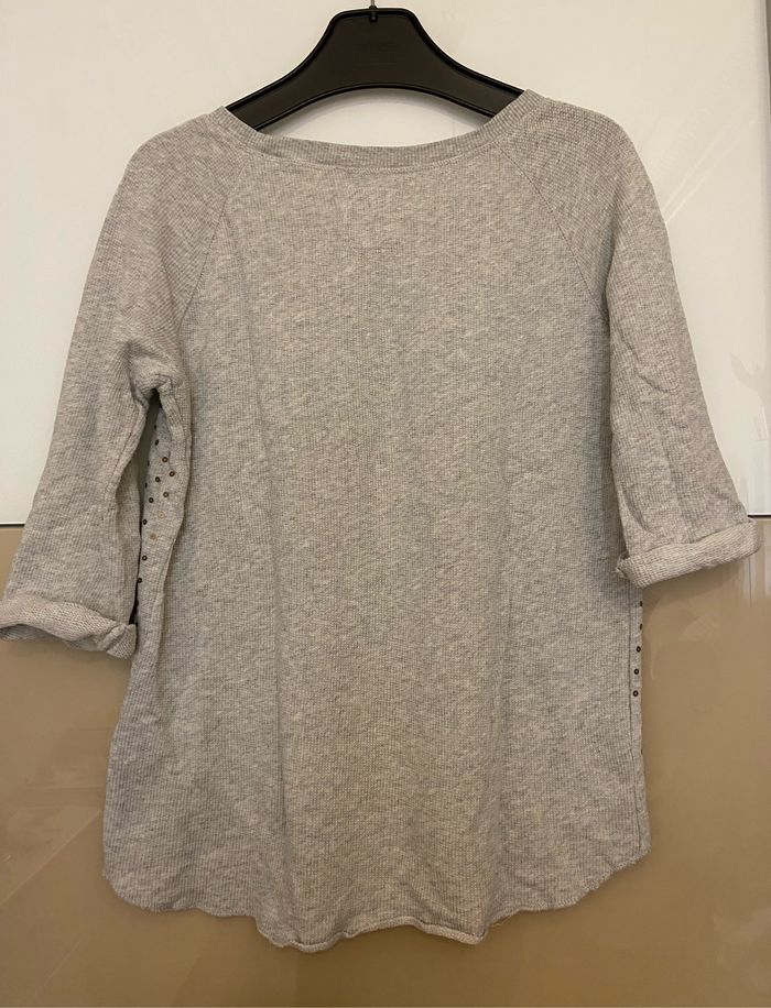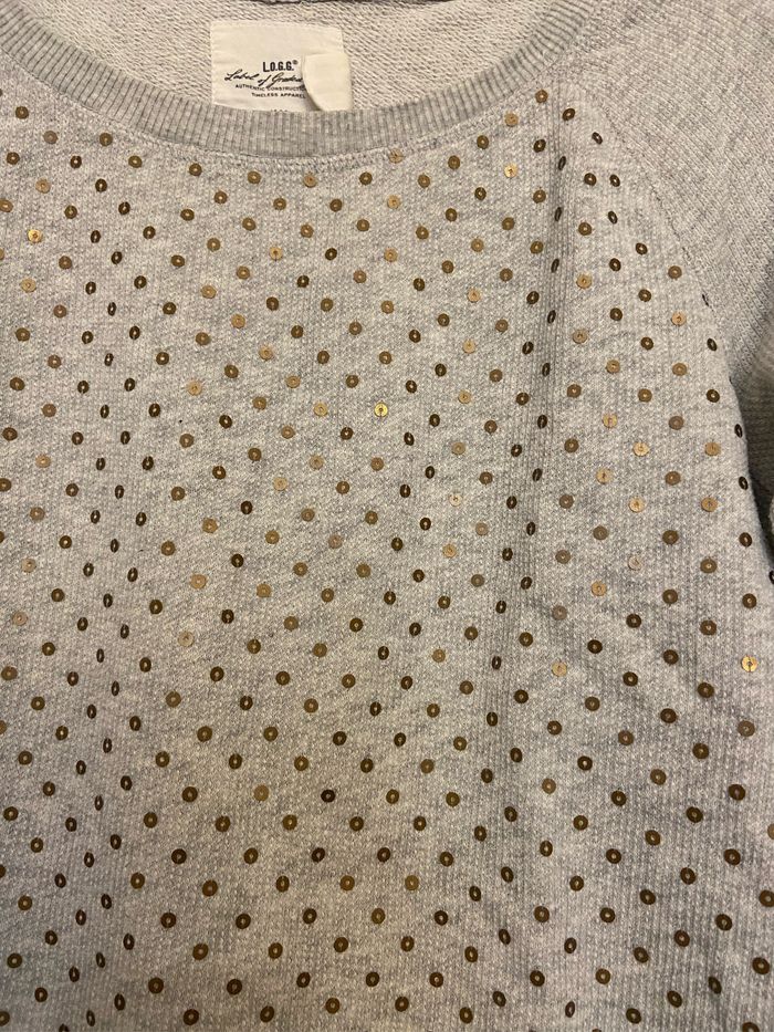 Haut gris clair avec sequins dorés Matière éponge Longueur derrière 70 cm Coton polyester Manches 3/4