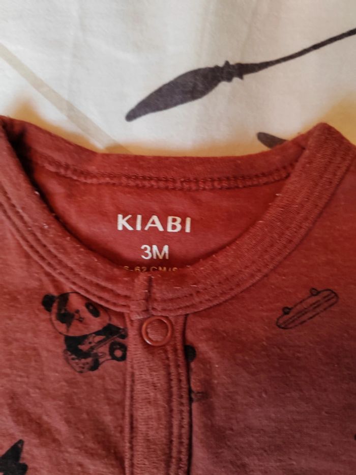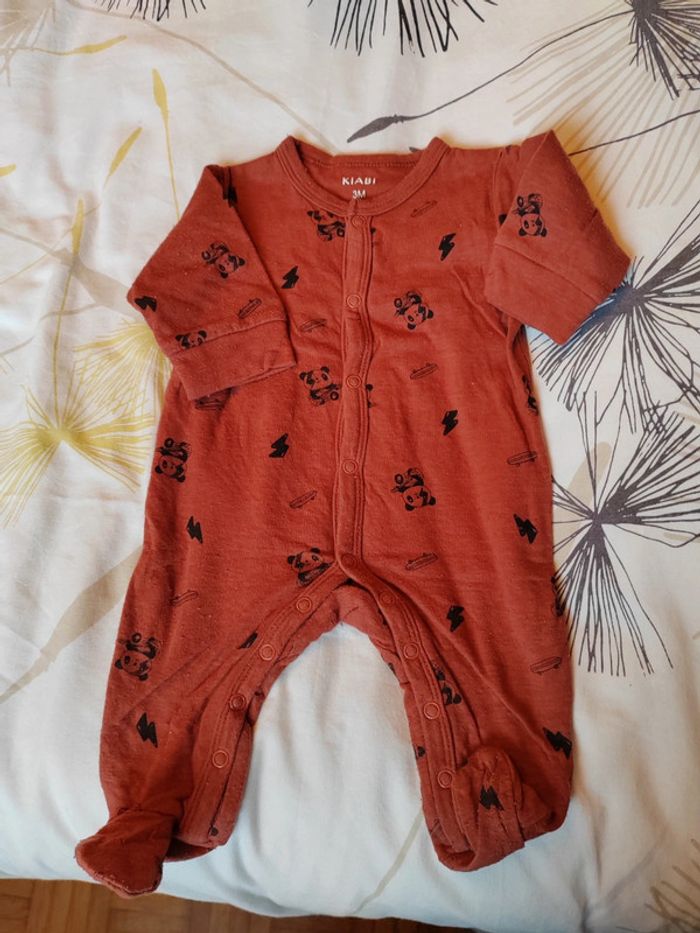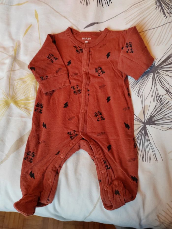 Je vends un pyjama en 3 mois de chez kiabi en très bon état couleur brique. Il s'ouvre par devant.