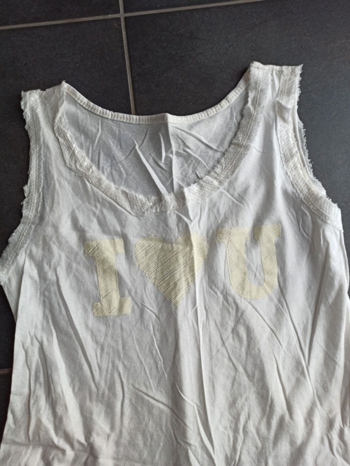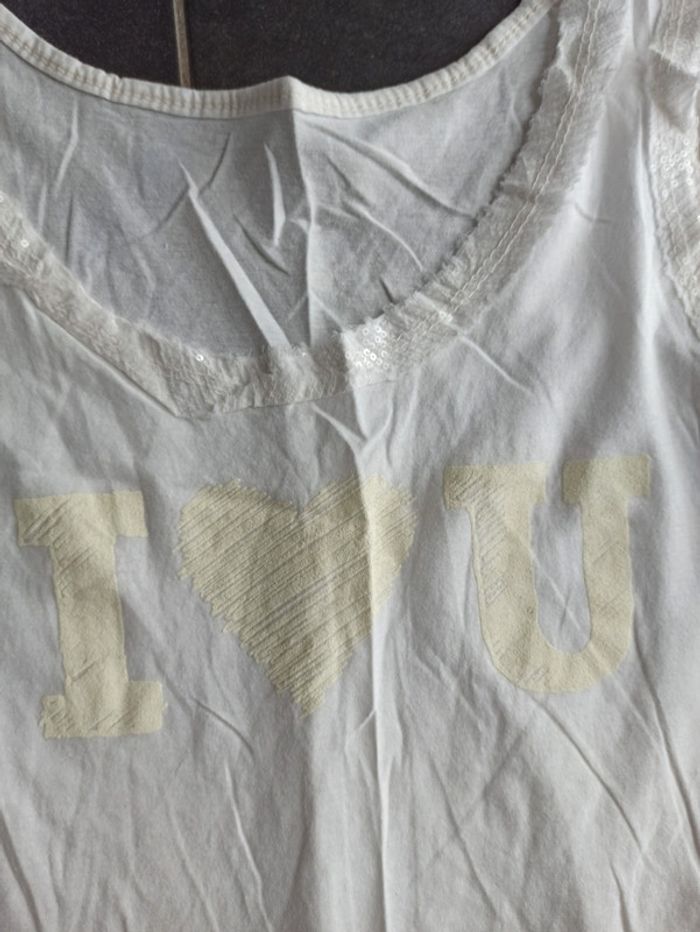 #clemhdu83_tuniquel Tunique écru dégradé beige.. Logo i love you devant. Sequins aux manches et décolleté. Taille unique du 36 au 42 . Made in Italy. Coton et elasthane. Excellent état, porte 1 fois Longueur à la pointe 106cm