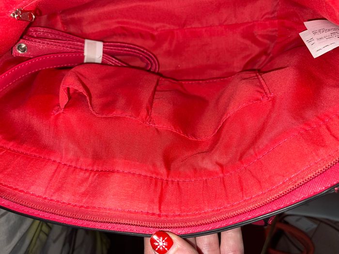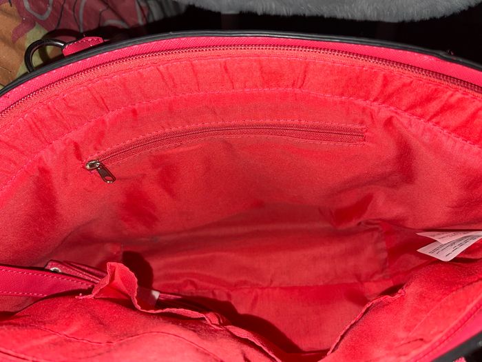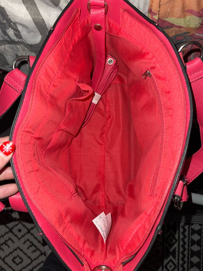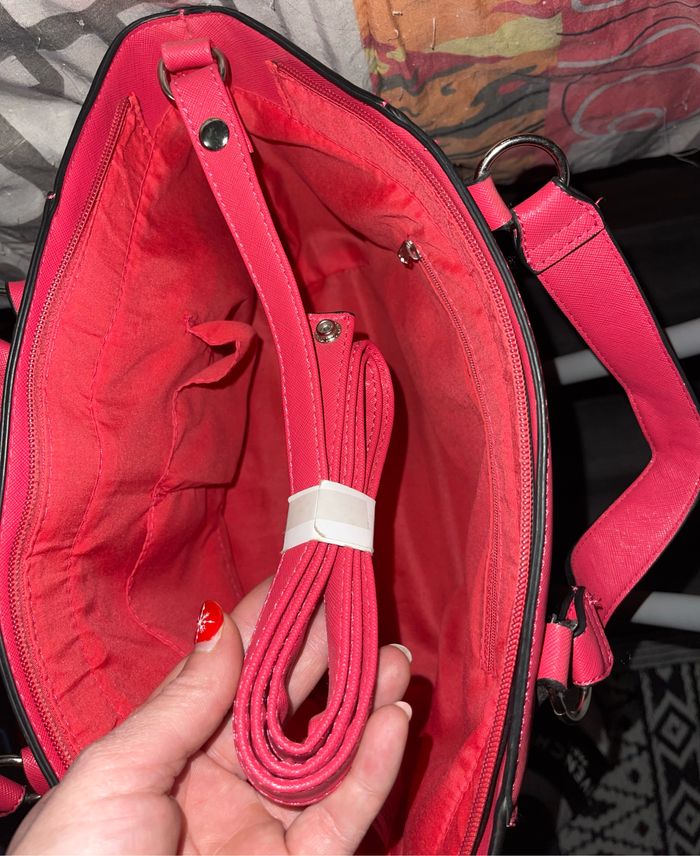 Utilisé 1 seule fois seulement ! Tout neuf. Différentes pochettes de rangement à l’intérieur et également une sur le devant du sac à main. Bandoulière toute neuf encore scotché dans le sac. Possibilité de porter le sac en bandoulière.