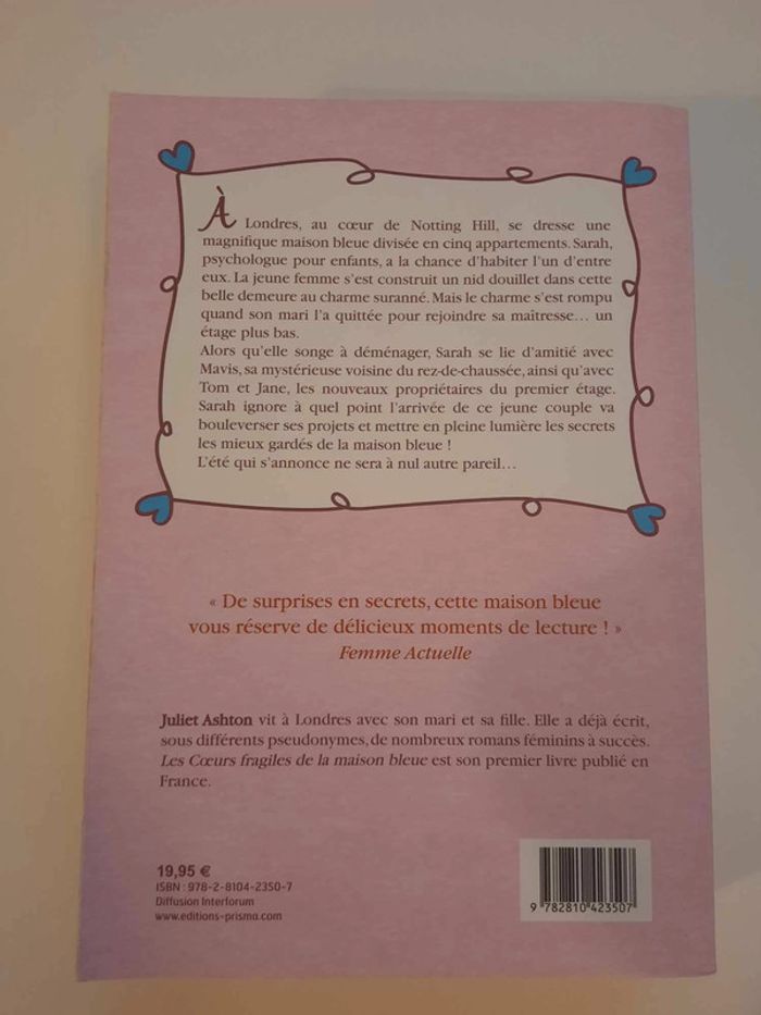 Les coeurs fragiles de la maison bleue de Juillet Ashton Maison d’édition : Editions Prisma Résumé : A Londres, au cœur de Notting Hill, se dresse une magnifique maison bleue divisée en cinq appartements. Sarah, psychologue pour enfants, a la chance d’habiter l’un d’entre eux. La jeune femme s’est construit un nid douillet dans cette belle demeure au charme suranné. Mais le charme s’est rompu quand son mari l’a quittée pour rejoindre sa maîtresse … un étage plus bas. Alors qu’elle songe à déménager, Sarah se lie d’amitié avec Mavis, sa mystérieuse voisine du rez-de-chaussée, ainsi qu’avec Tom et Jane, les nouveaux propriétaires du premier étage. Sarah ignore à quel point l’arrivée de ce jeune couple va bouleverser ses projets et mettre en pleine lumière les secrets les mieux gardés de la maison bleue ! L’été qui s’annonce ne sera à nul autre pareil …. Pages jaunies Légers accrocs sur le dos