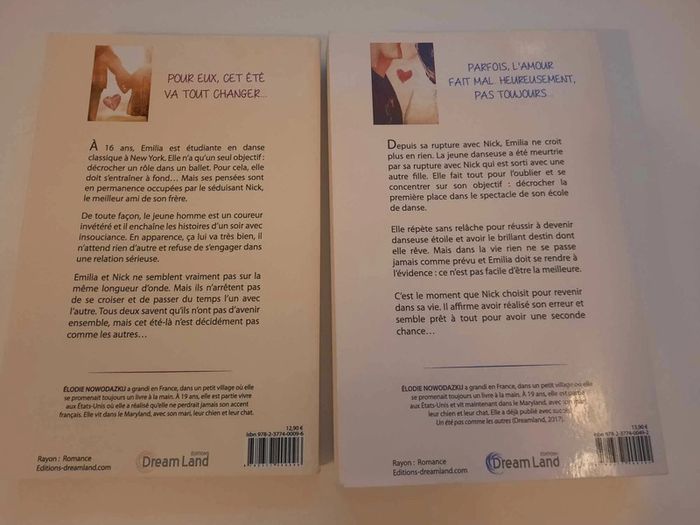 Saga Broken Dreams : Em & Nick, Tome 1 et 2 d’Elodie Nowodazkij Maison d’édition : Dreamland de City Editions Résumé : Pour eux, cet été va tout changer ... A 16 ans, Emilia est étudiante en danse classique à New York. Elle n'a qu'un seul objectif : décrocher un rôle dans un ballet. Pour cela, elle doit s'entraîner à fond ... Mais ses pensées sont en permanence occupées par le séduisant Nick, le meilleur ami de son frère. De toute façon, le jeune homme est un coureur invétéré et il enchaîne les histoires d'un soir avec insouciance. En apparence, ça lui va très bien, il n'attend rien d'autre et refuse de s'engager dans une relation sérieuse. Emilia et Nick ne semblent vraiment pas sur la même longueur d'onde. Mails ils n'arrêtent pas de se croiser et de passer du temps l'un avec l'autre. Tous deux savent qu'ils n'ont pas d'avenir ensemble, mais cet été là n'est décidément pas comme les autres ... Dos tome 2 cassé Haut du dos tome 2 abîmé Coins légèrement abimés Prix neuf du lot : 26 € 80 Prix du lot : 5 € Pas de vente à l’unité