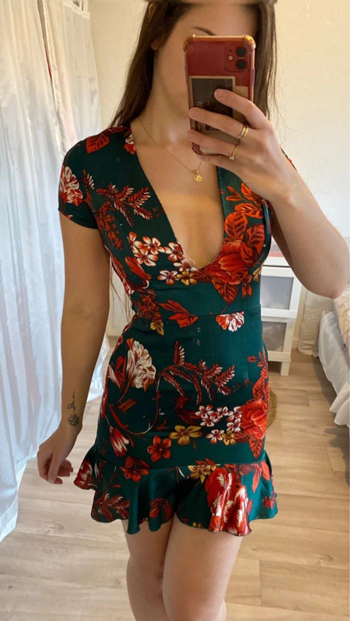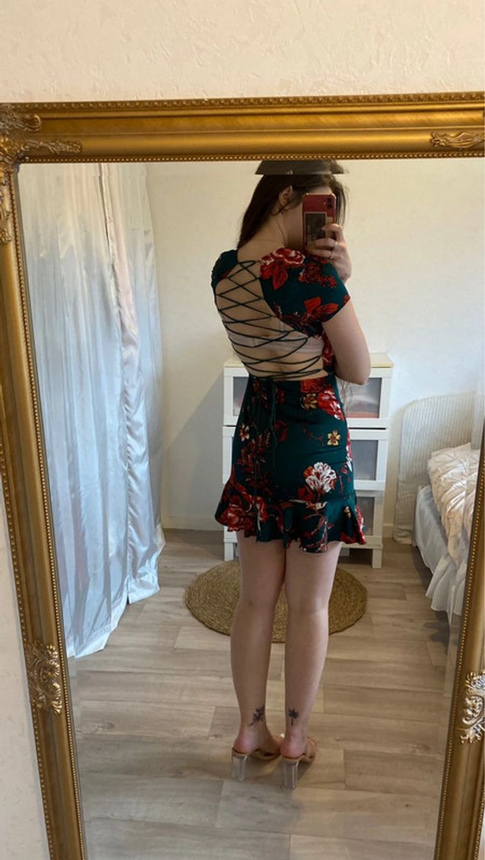 Lacage dans le dos et fermeture, à volants en bas, décolleté plongeant et manches courtes #mojito1Taille34