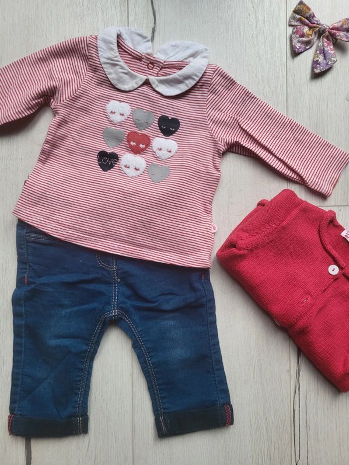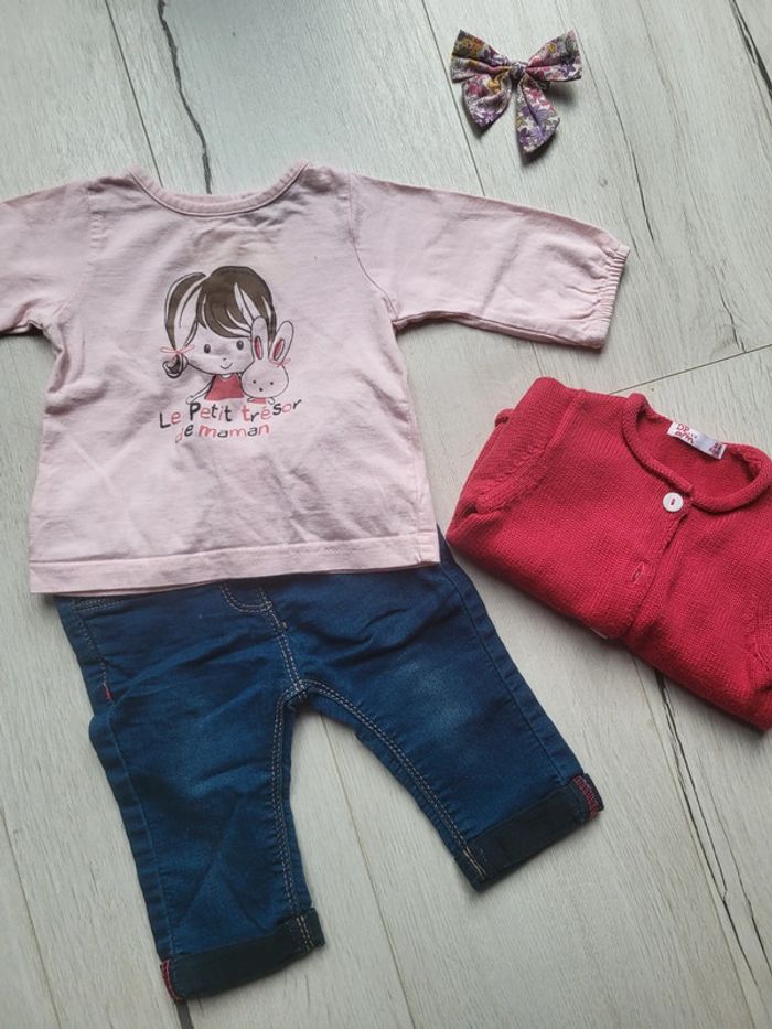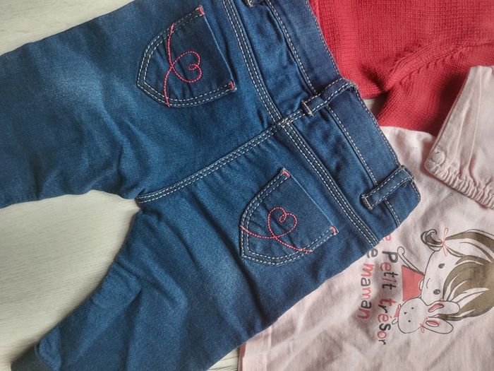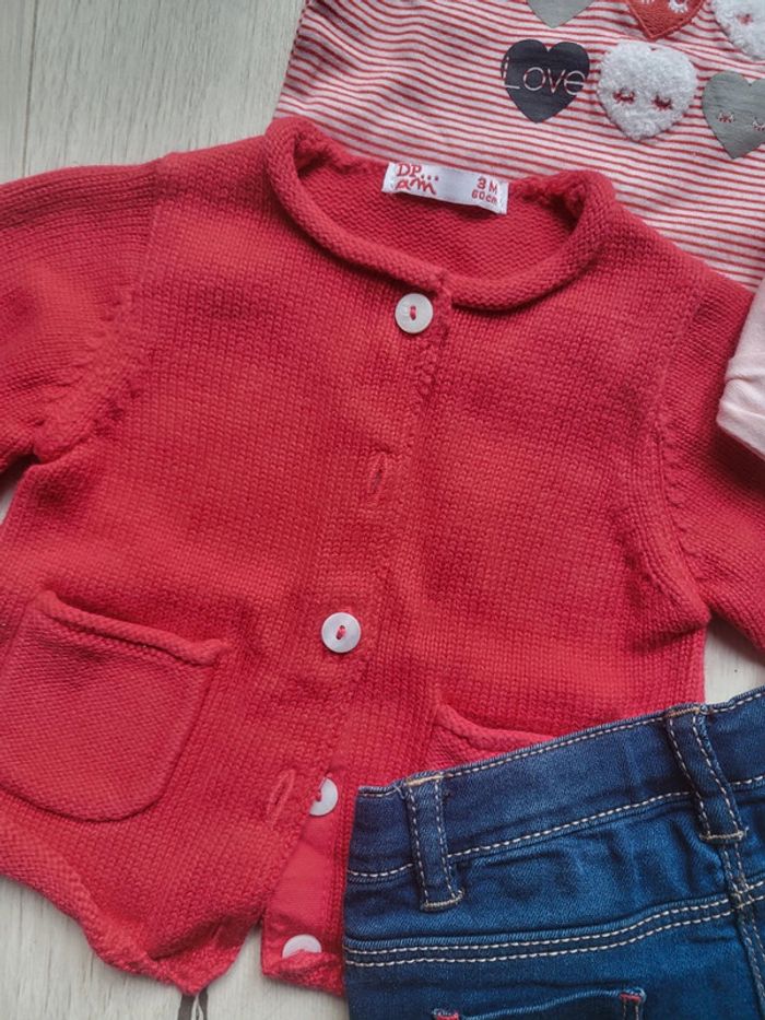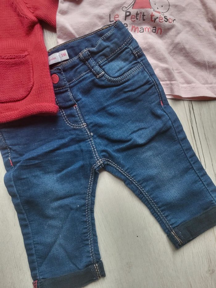 Très bon état peu porté. Ensemble 4 pièces taille 3 mois fille. Un slim denim souple gemo. Deux hauts dans les tons roses/rouge (obaibi...). Un gilet dpam. #3moistatiana #ensemble3mois #lot3mois #lotfille #dpam #gilet #ensemblehiverfille